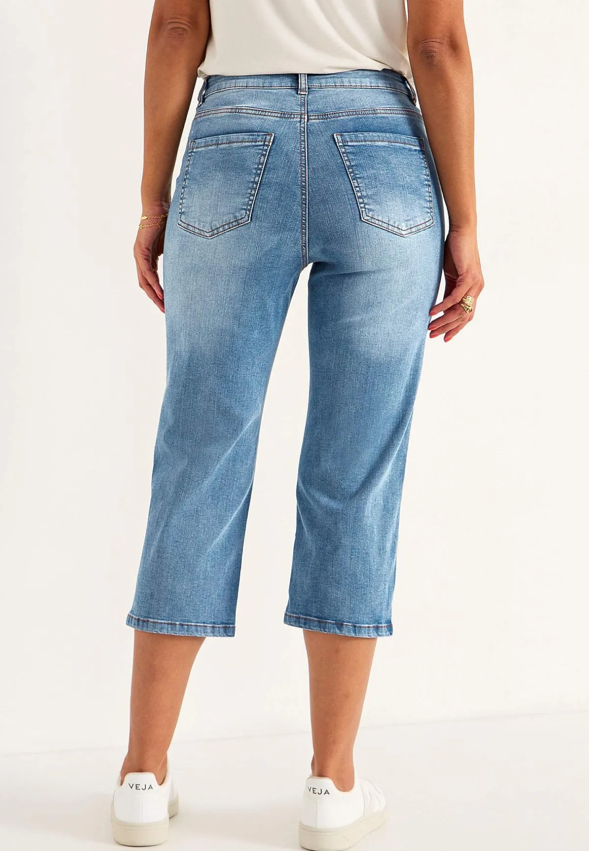• Femficksdesign med knappar i bensluten.