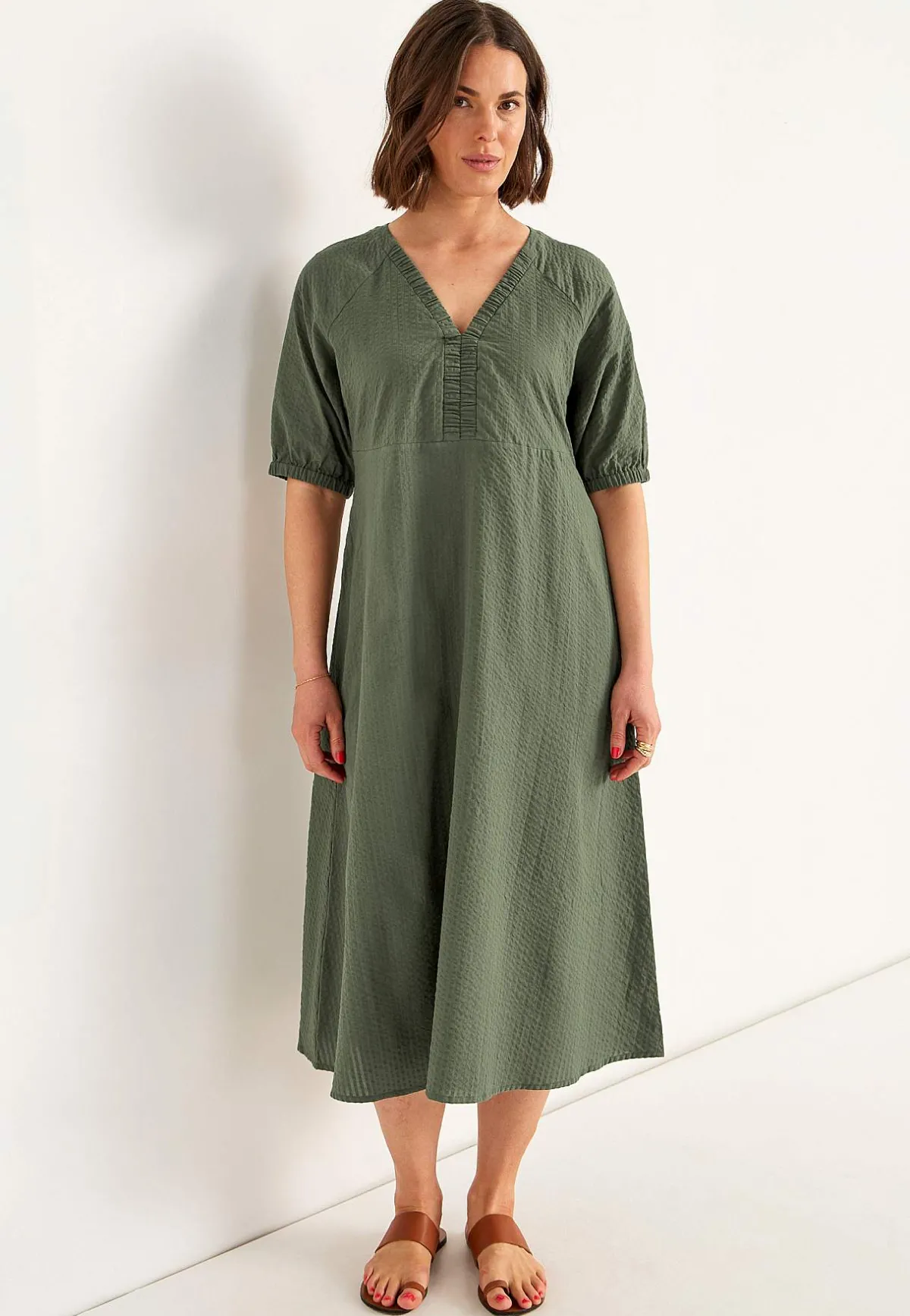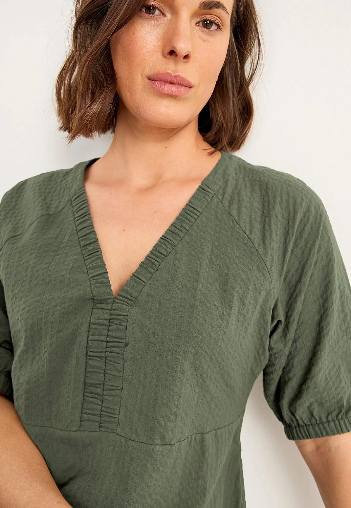 • V-ringad, rynkad halsringning.