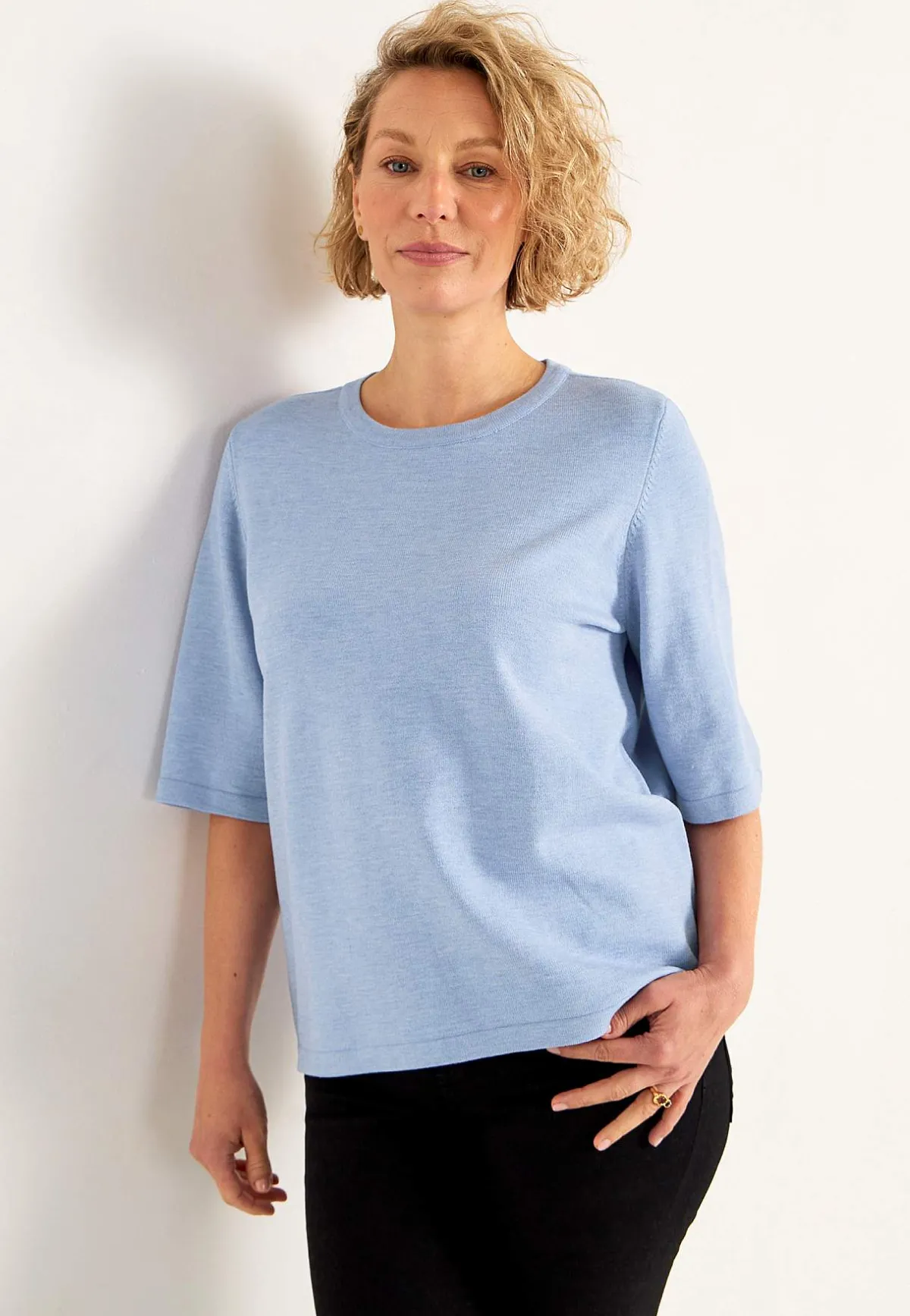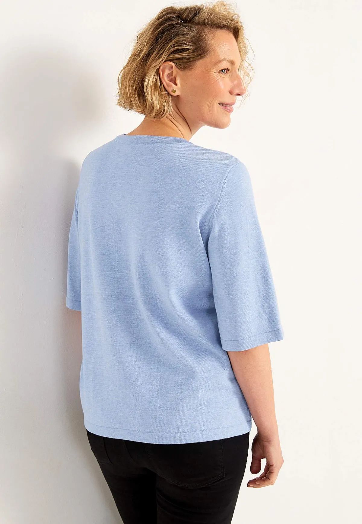 • Korta ärmar. Fully fashioned-stickade ärmhål.