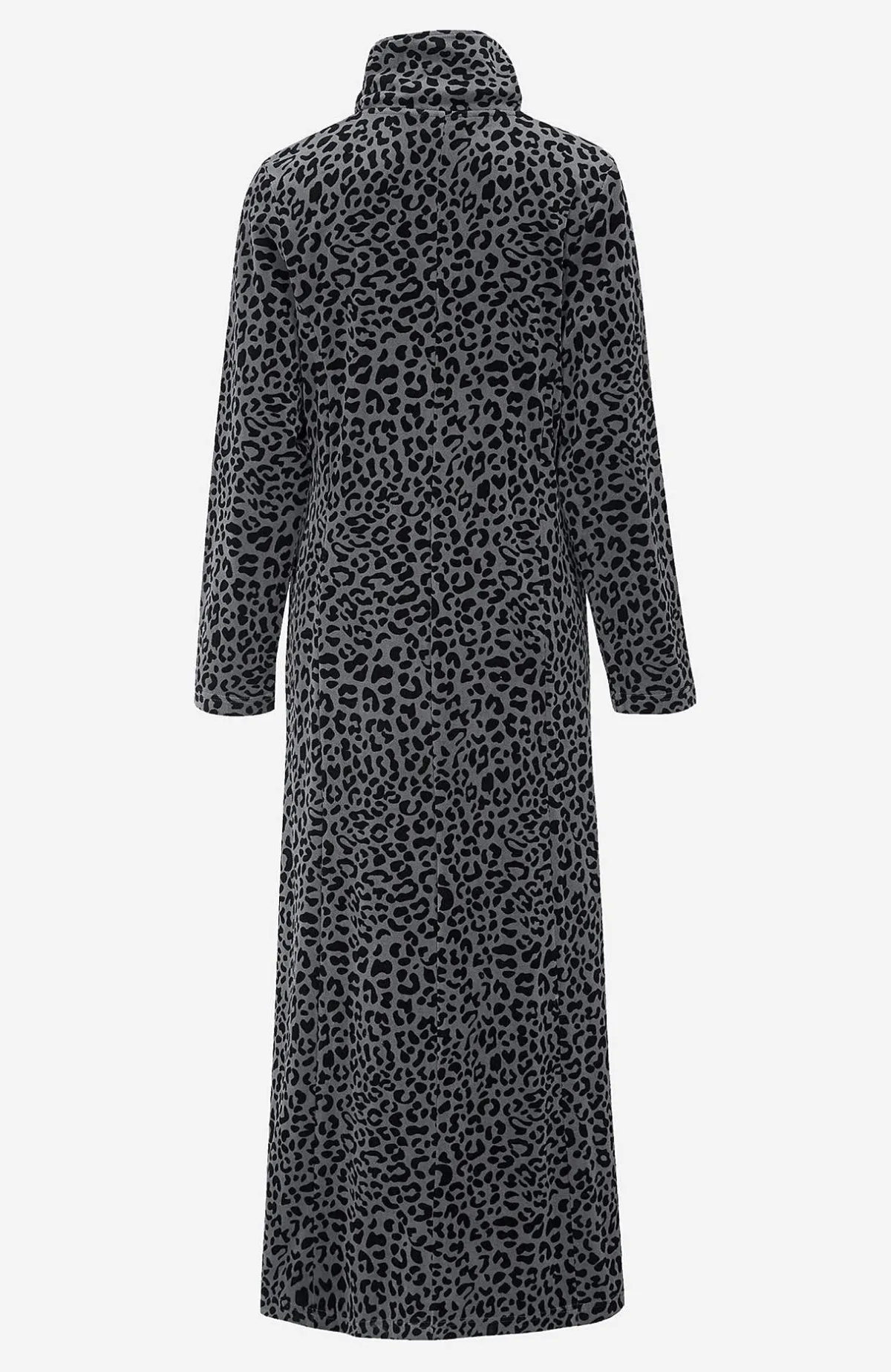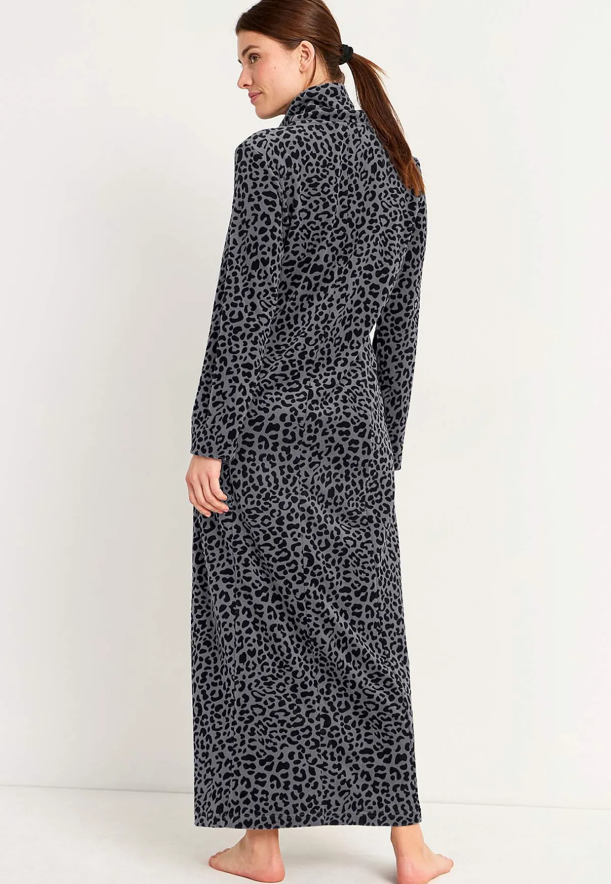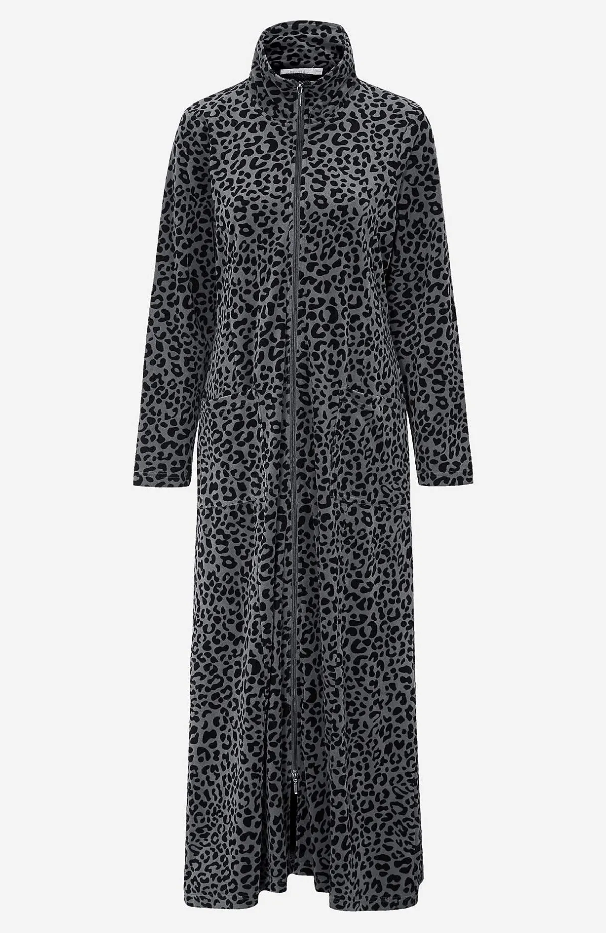 Lång, skön morgonrock i mjuk, mysig bomullsvelour med hög krage och praktisk tvåvägsdragkedja.