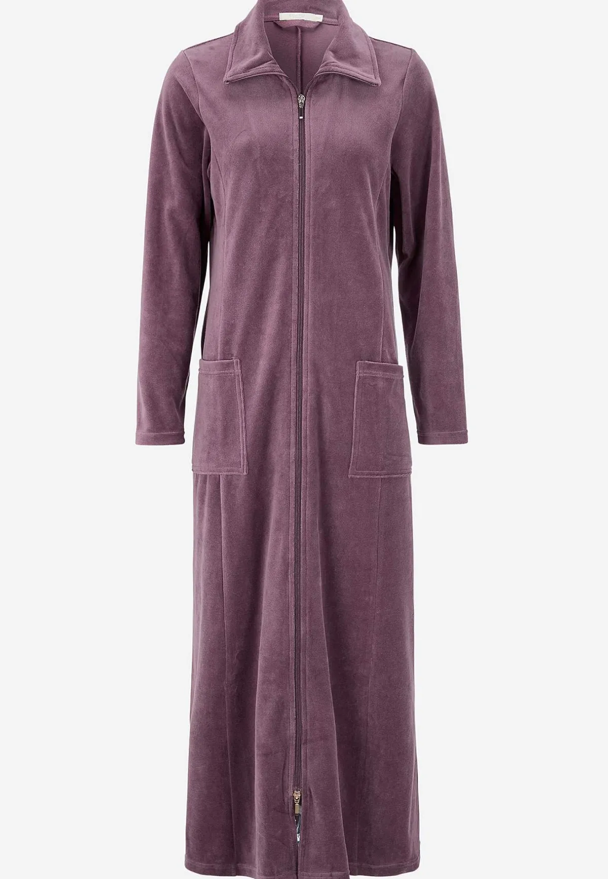 Lång, skön morgonrock i mjuk, mysig bomullsvelour med hög krage och praktisk tvåvägsdragkedja.