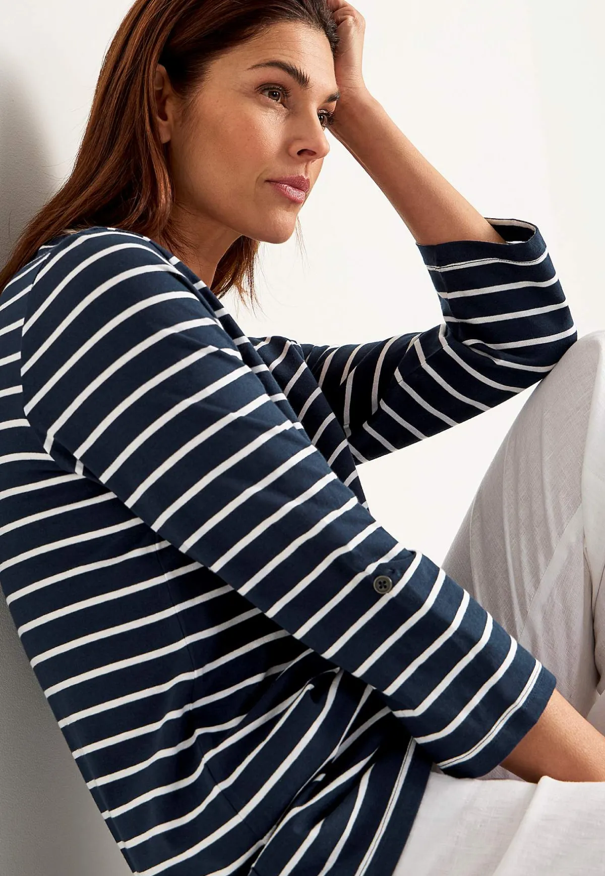 • 3/4-långa, uppvikbara ärmar med slejf och knapp.
