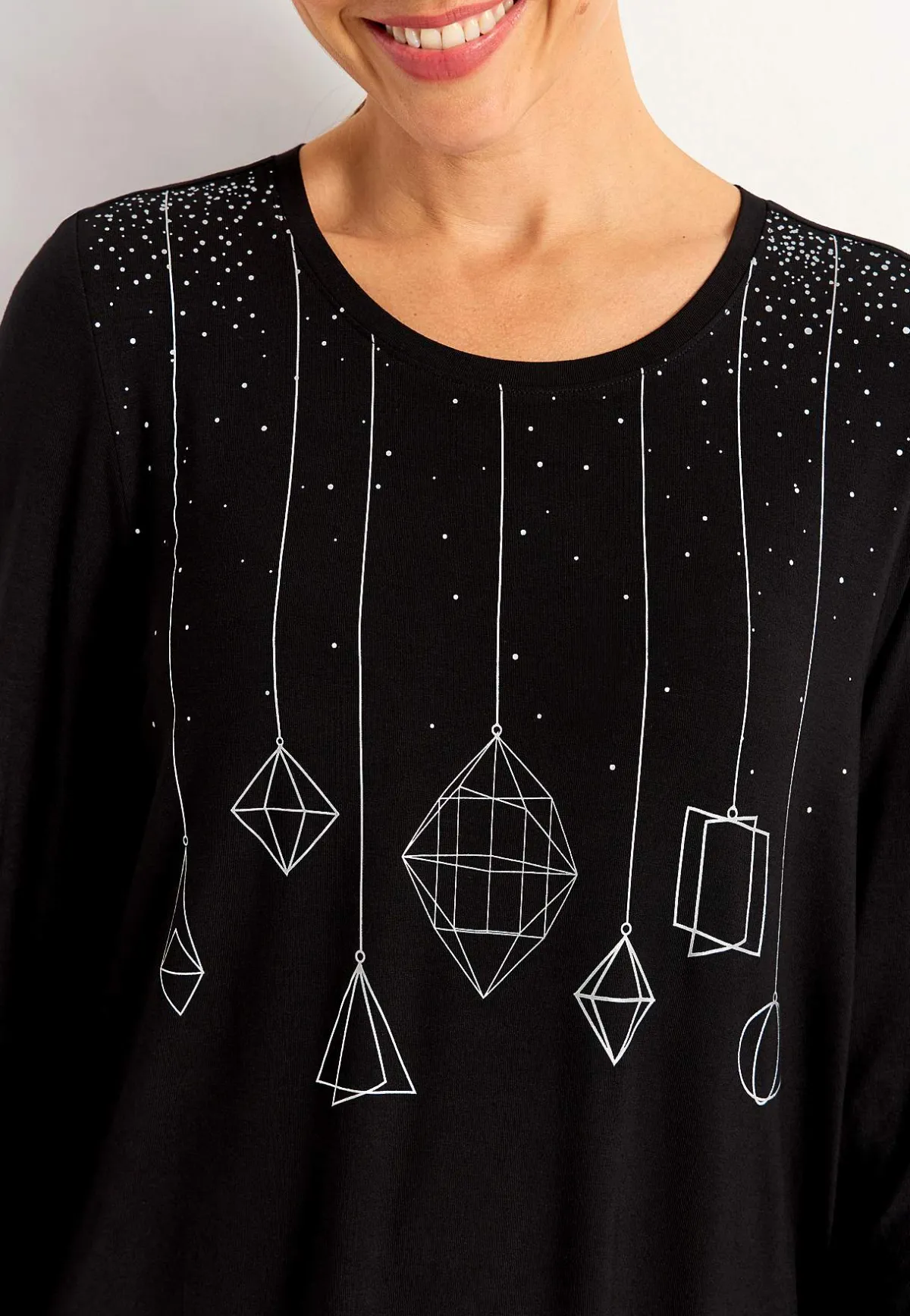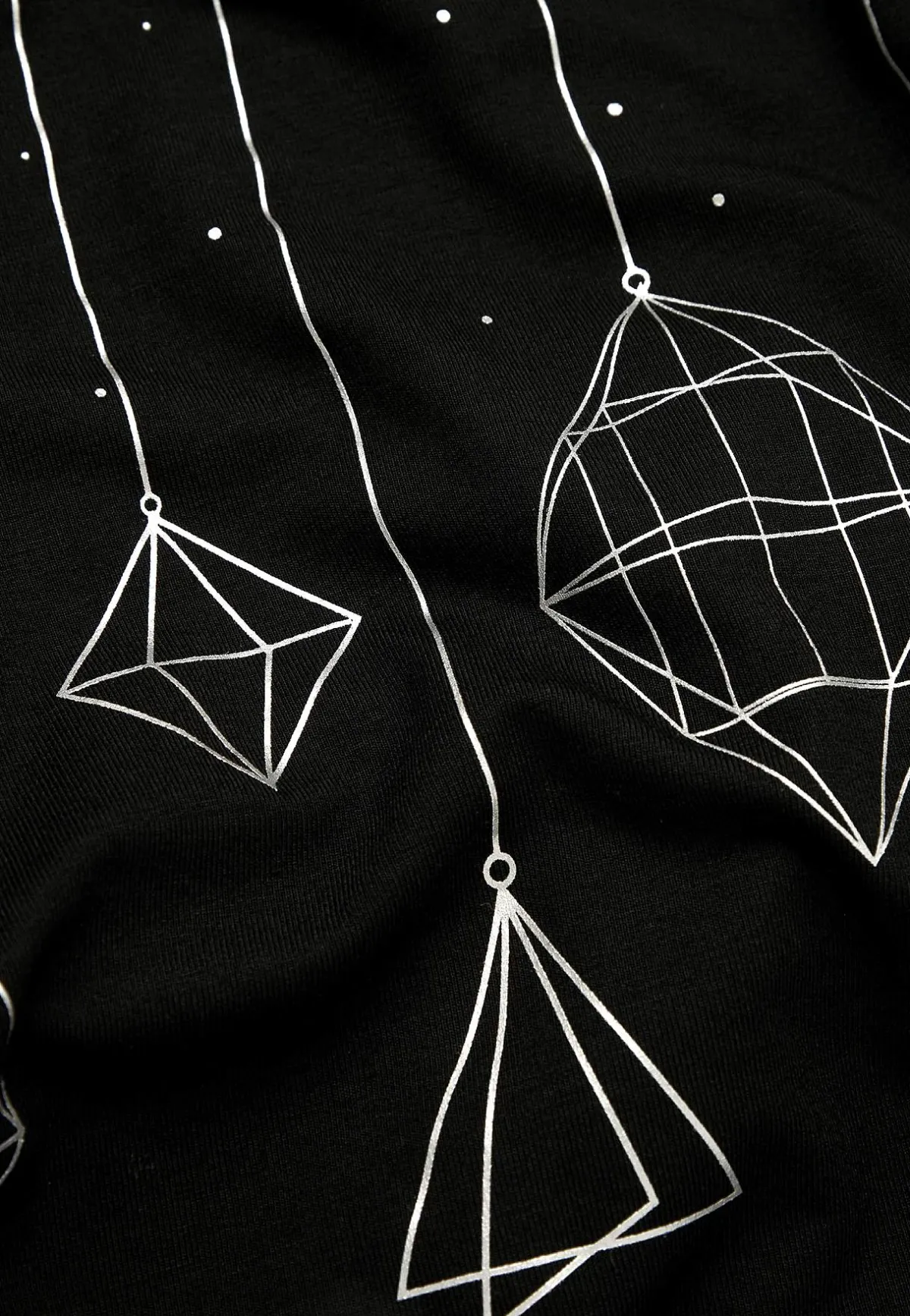 • Silverfärgat tryck med dekorativa julkulor.