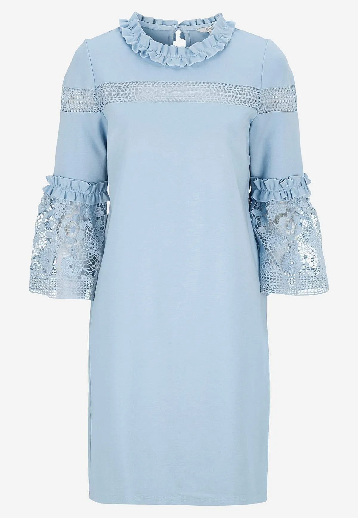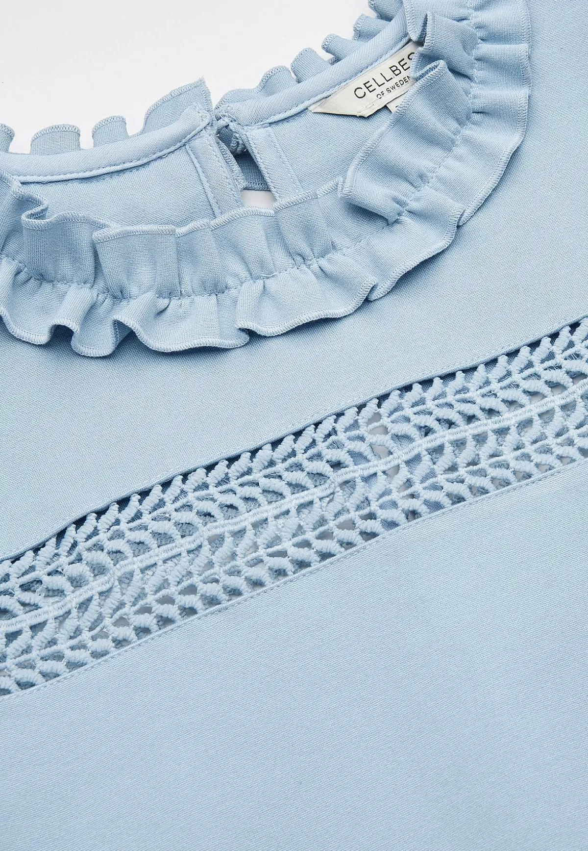 • Hög hals med dekorativ volang och knappöppning i nacken.