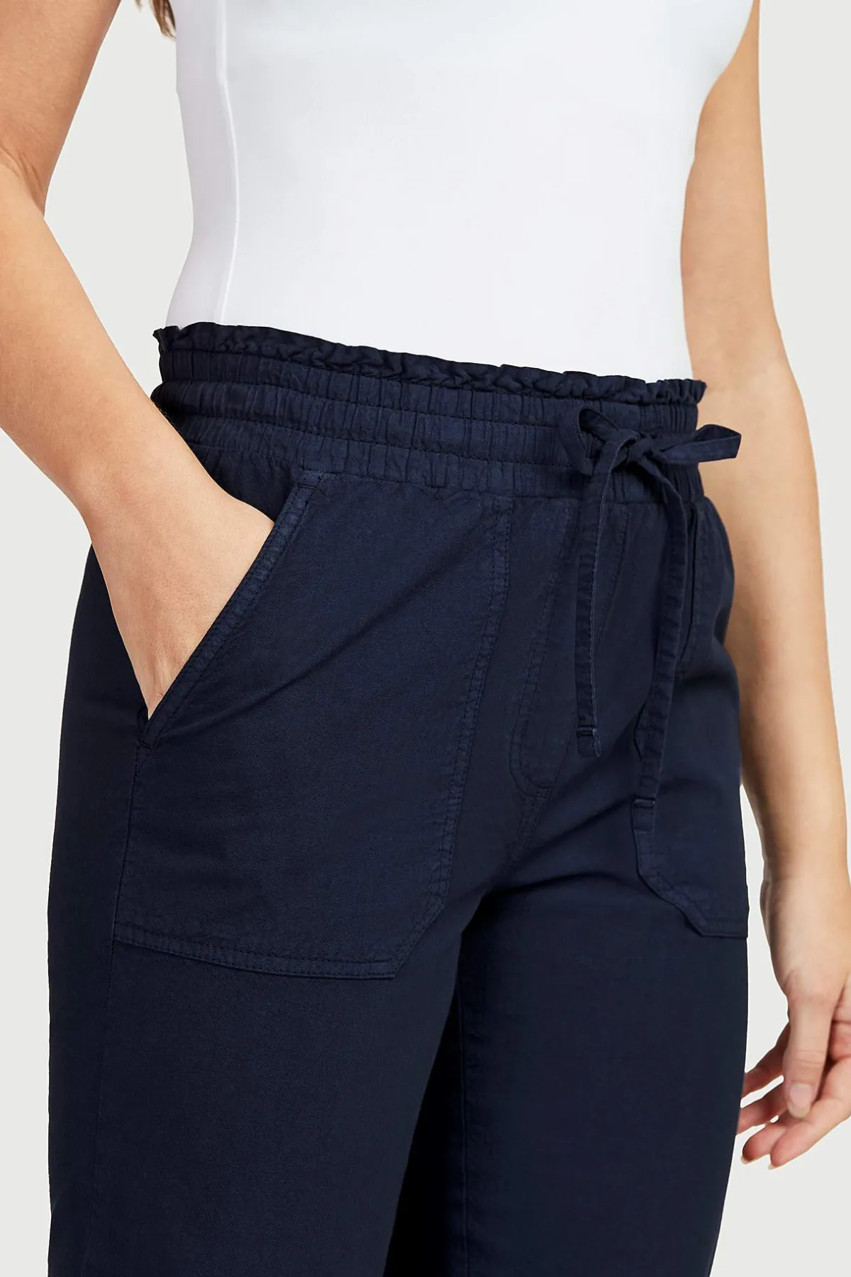 • Elastisk midja med dragsko och liten volang upptill