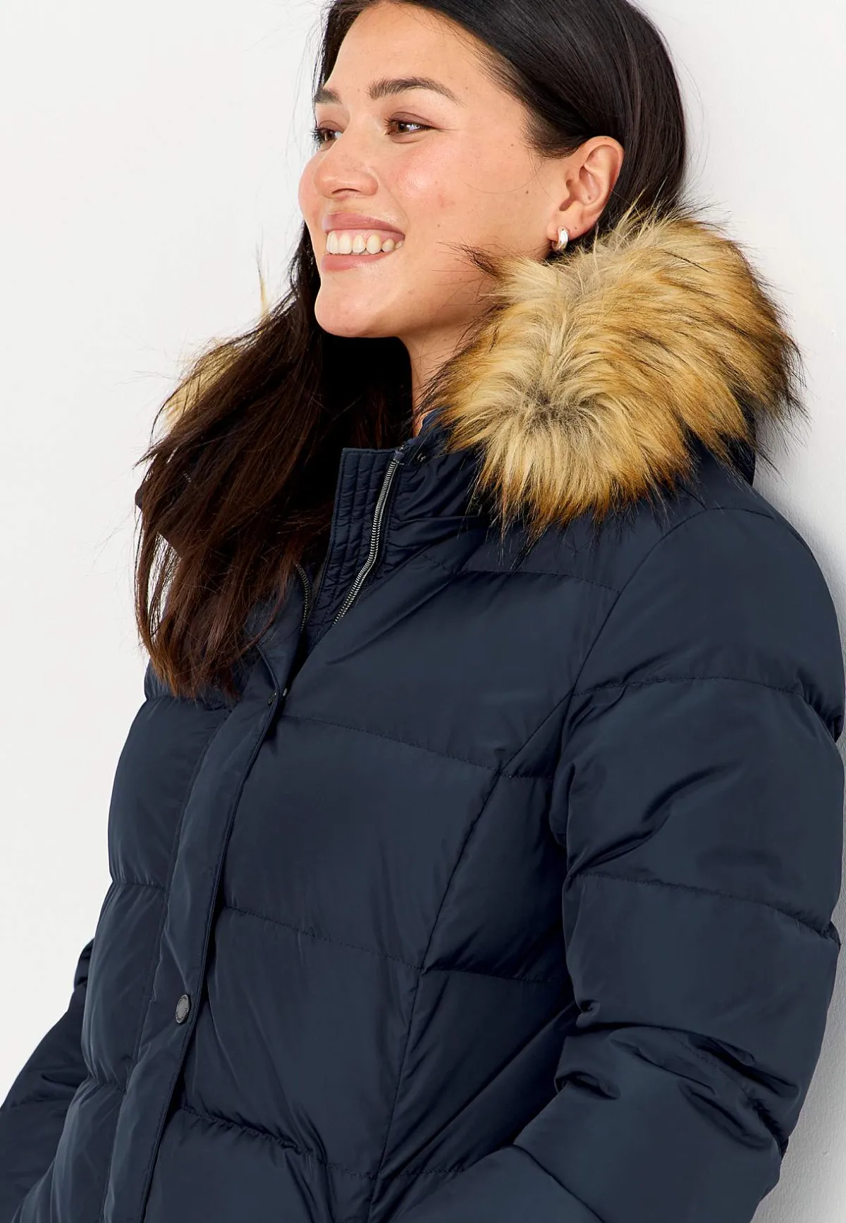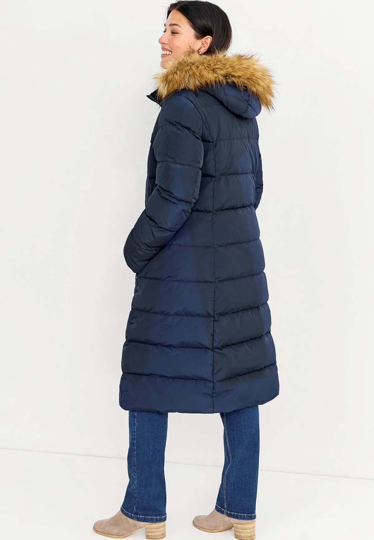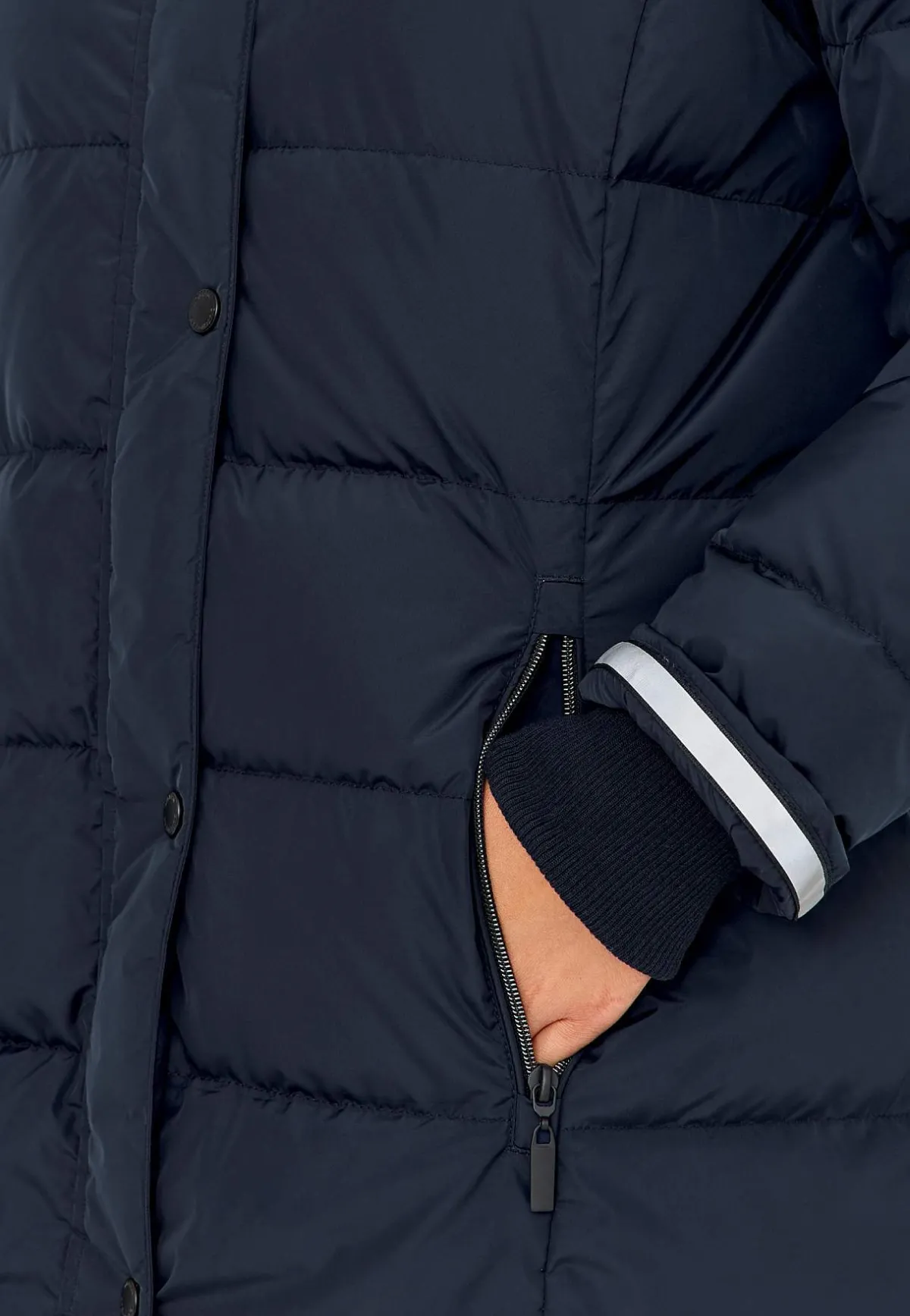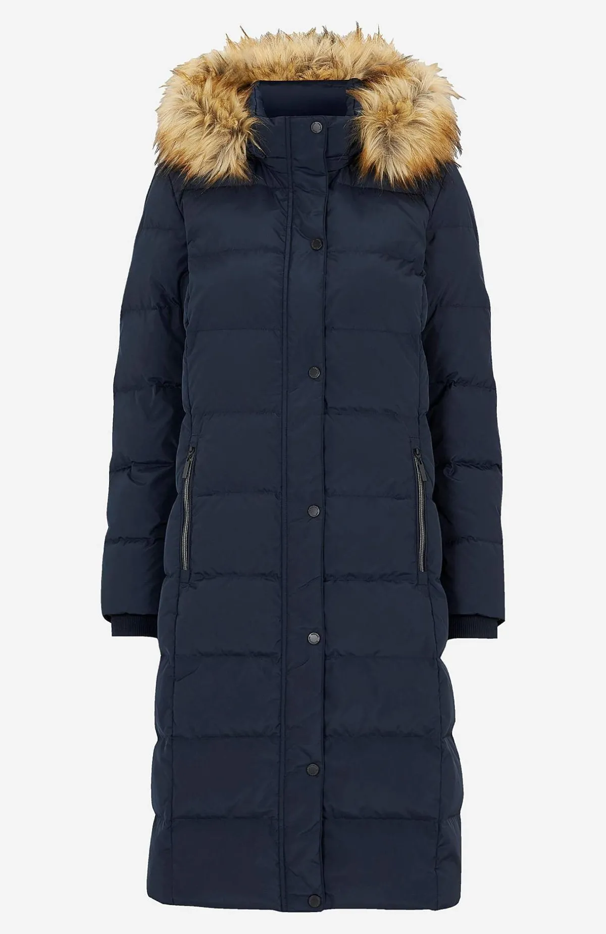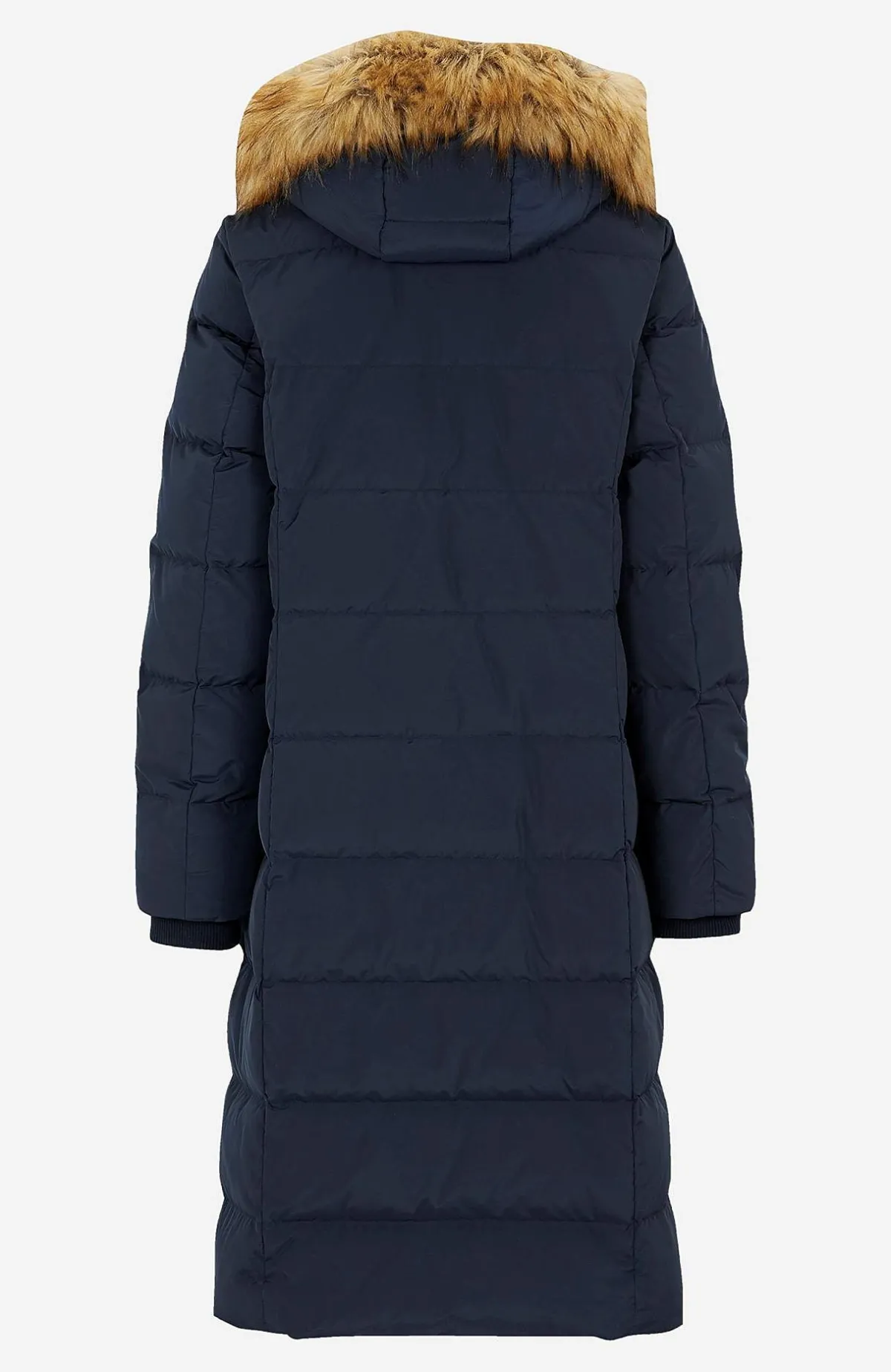 Kviltad dunkappa i härligt lång och varmfodrad modell. Stilsäker kappa med avtagbar huva med dragsko samt stopper och avtagbar pälsimitation. 2-vägsdragkedja med skyddande vindslå som har tryckknappar. Fickor med dragkedja. Uppvikbara ärmslut med reflexdetalj på insidan. Mudd i ärmslut. Innerficka. Rygglängden följer storleken ca 106-122 cm.