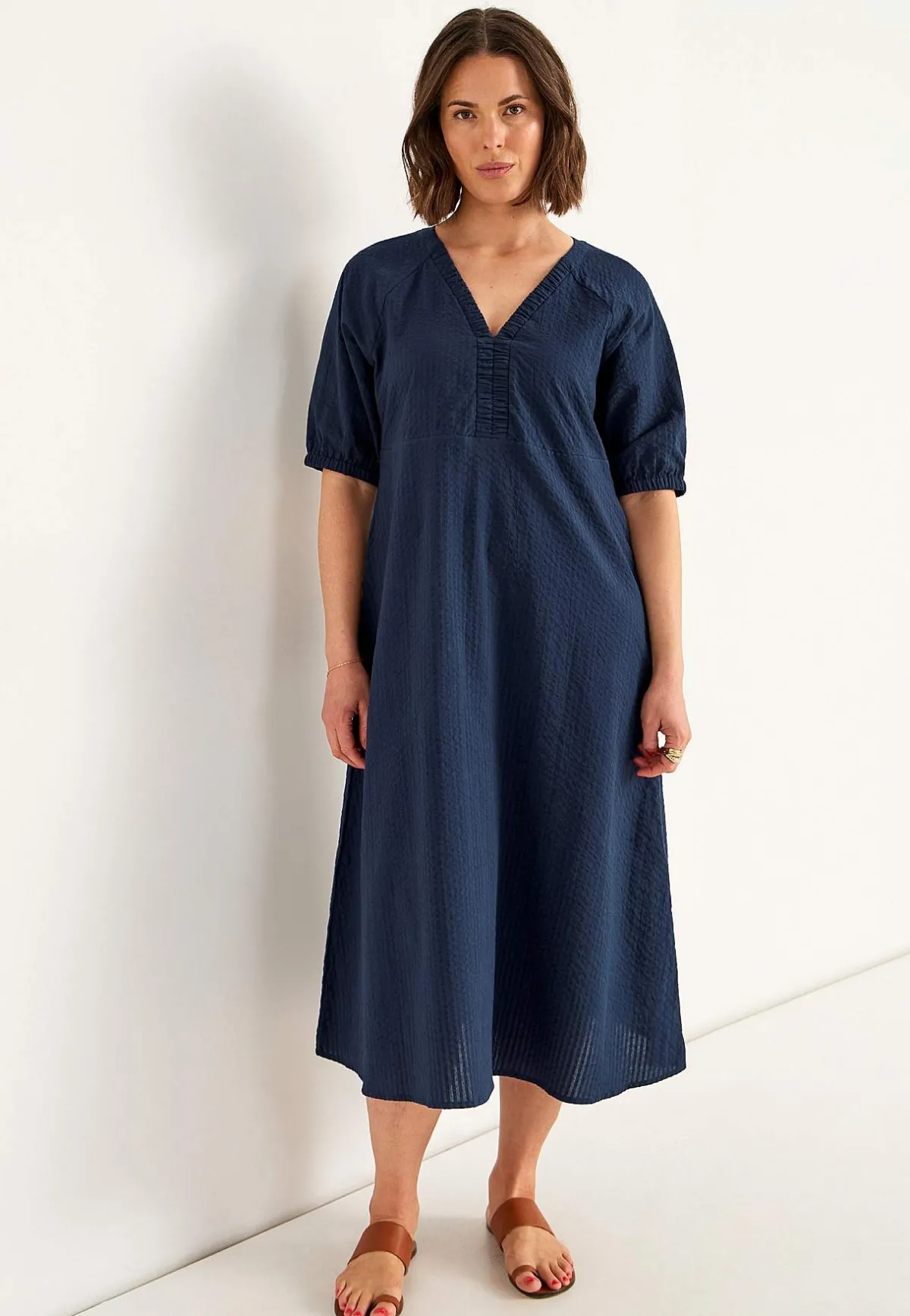 • V-ringad, rynkad halsringning.