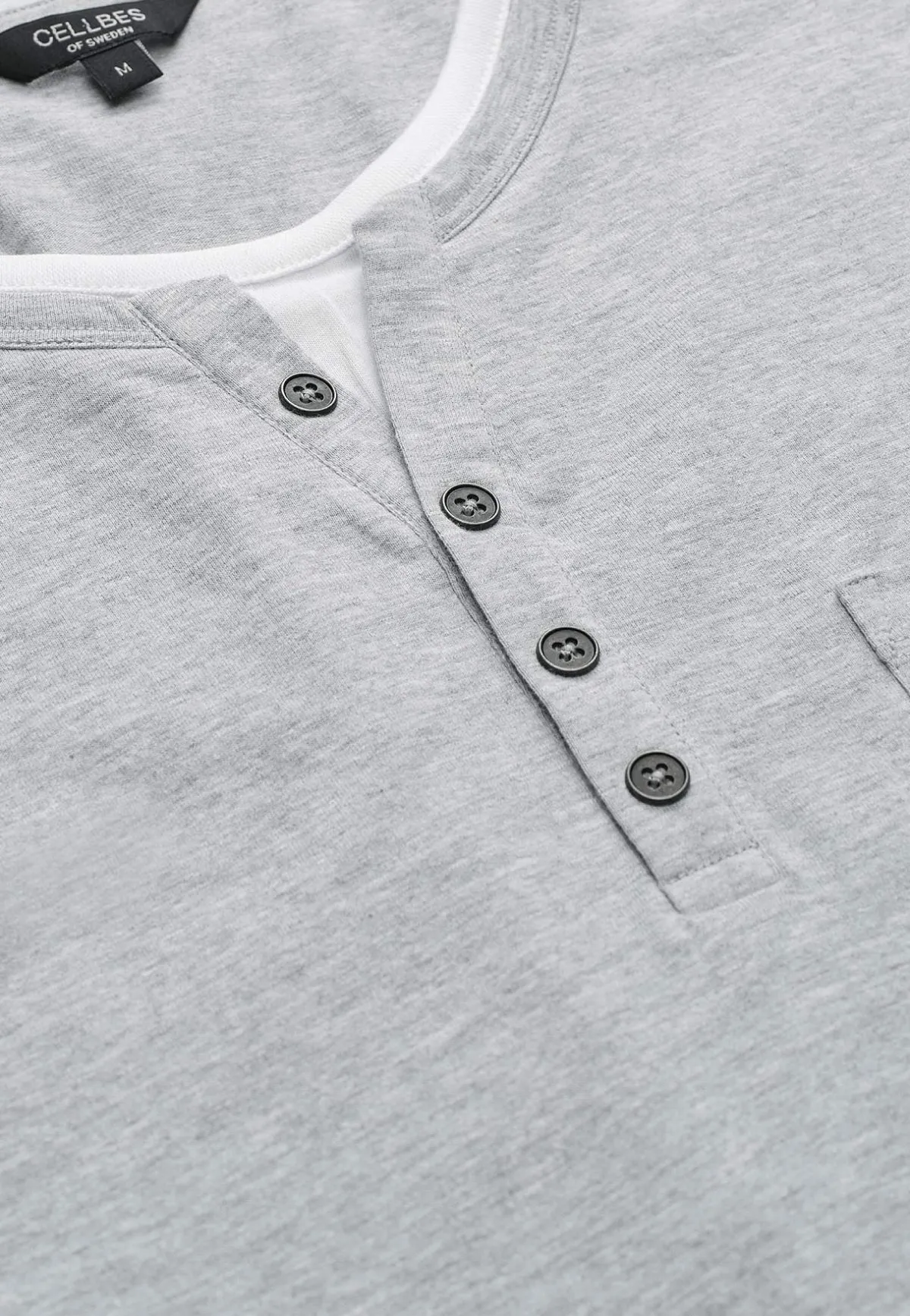 • Rund halsringning med liten v-ringning och en falsk knappöppning.