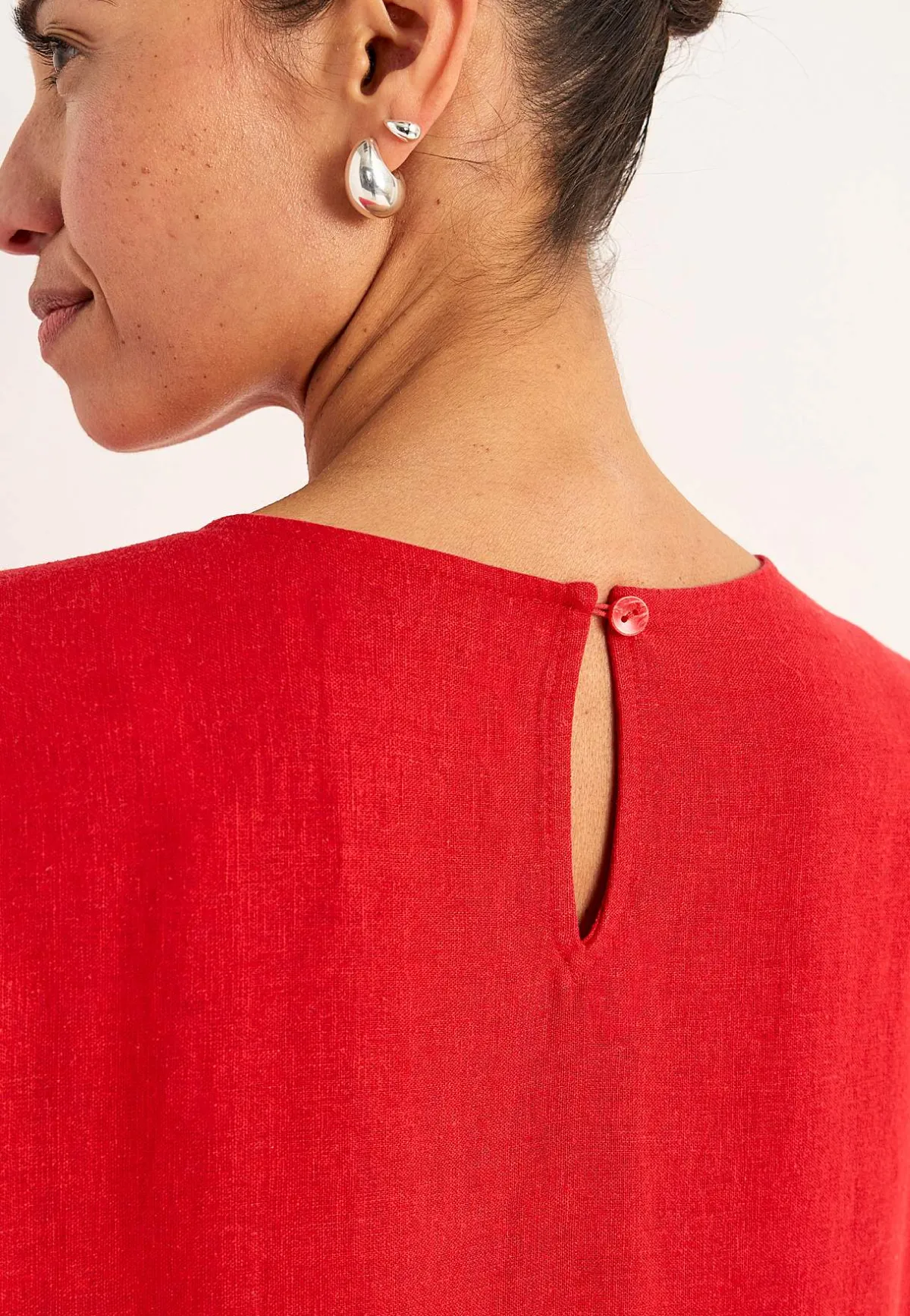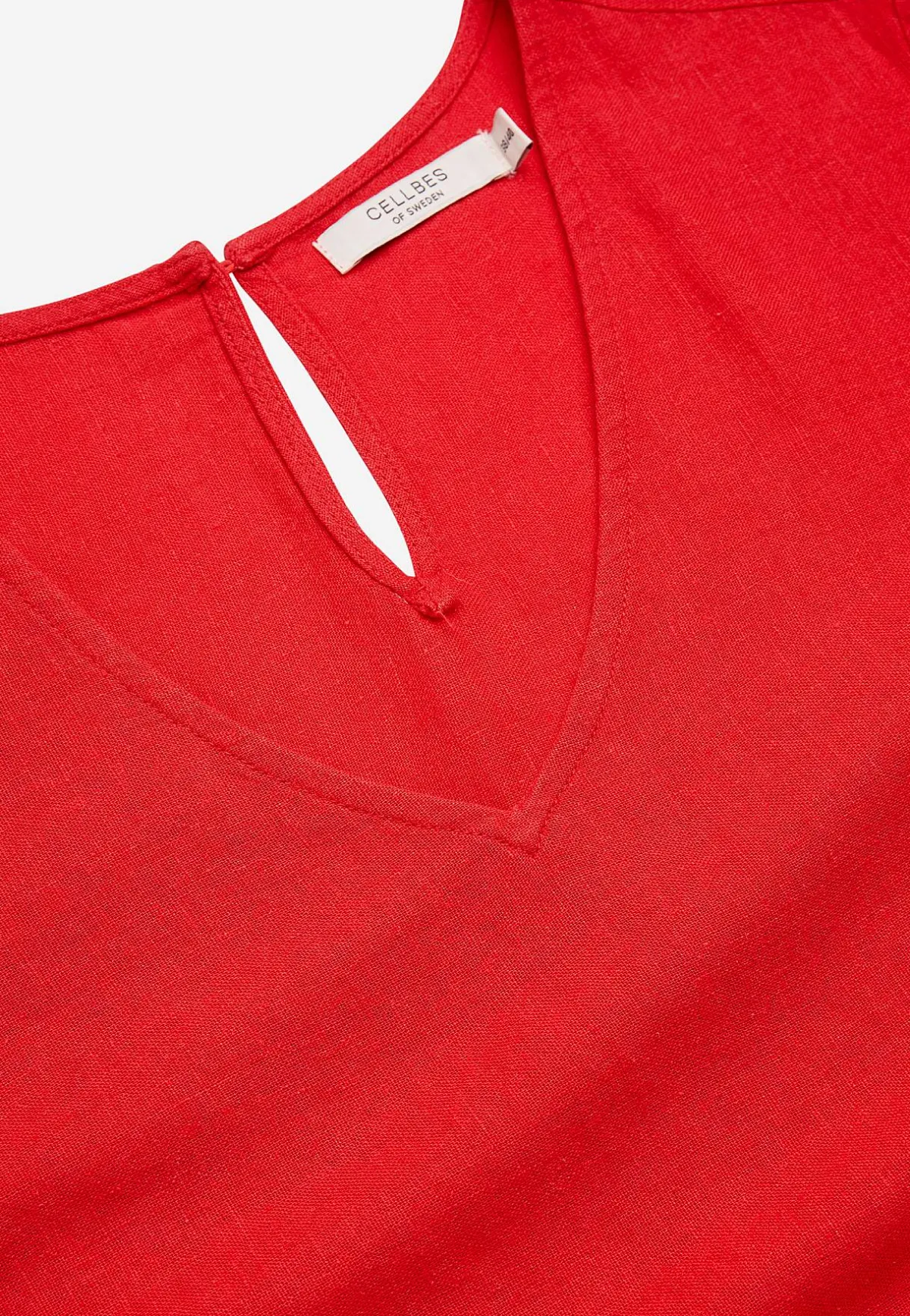• V-formad halsringning med klädd knapp och sprund i nacken.