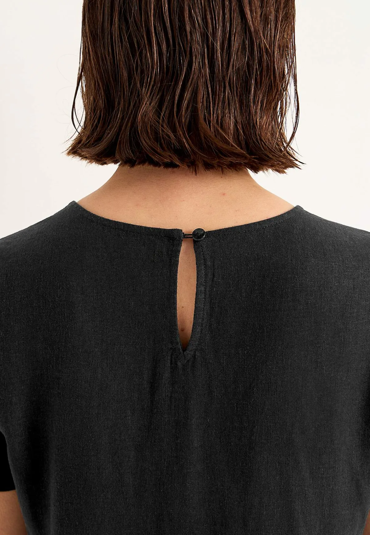 • V-formad halsringning med klädd knapp och sprund i nacken.