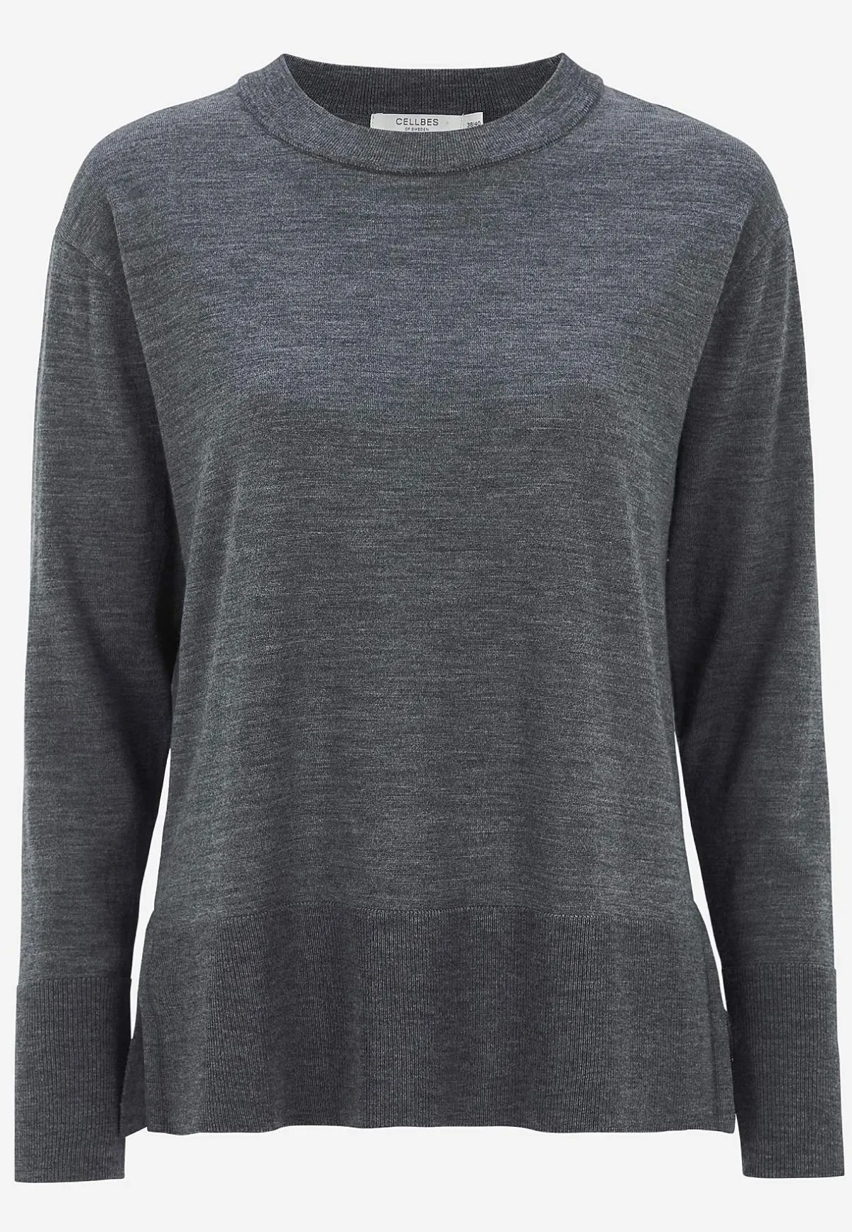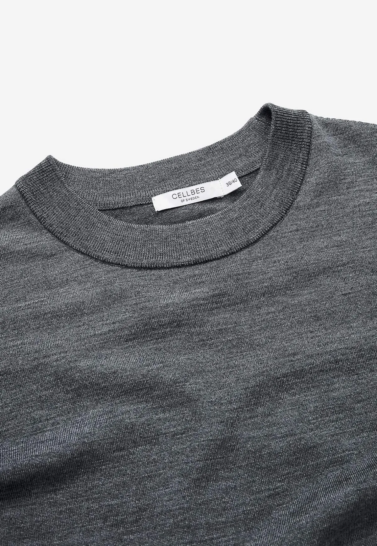 • Klassisk rundhals med ribbstickad mudd.