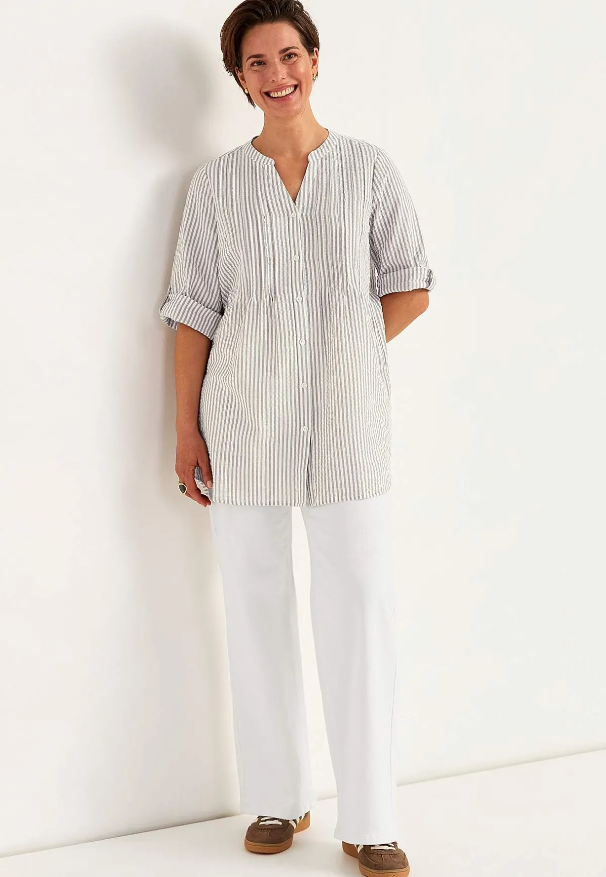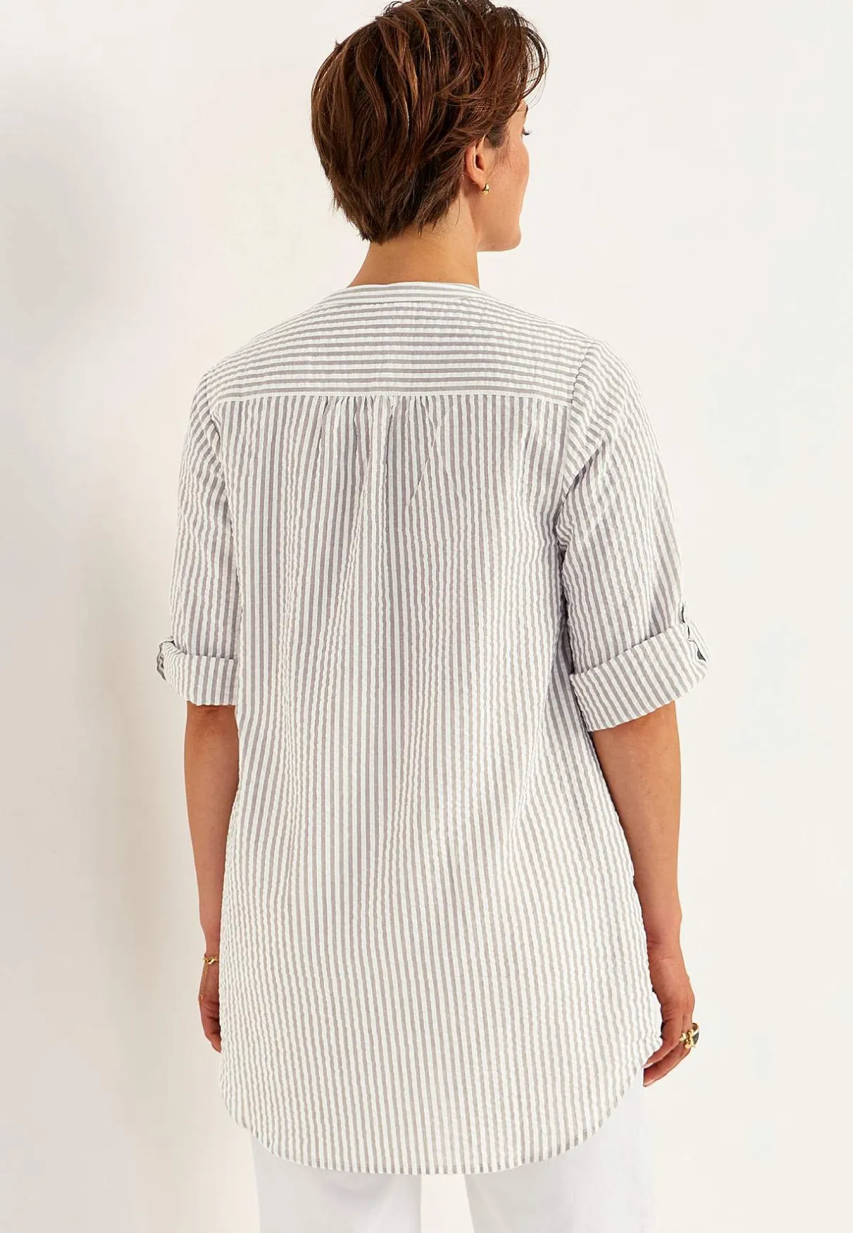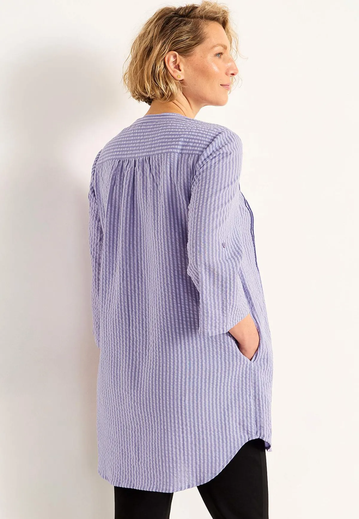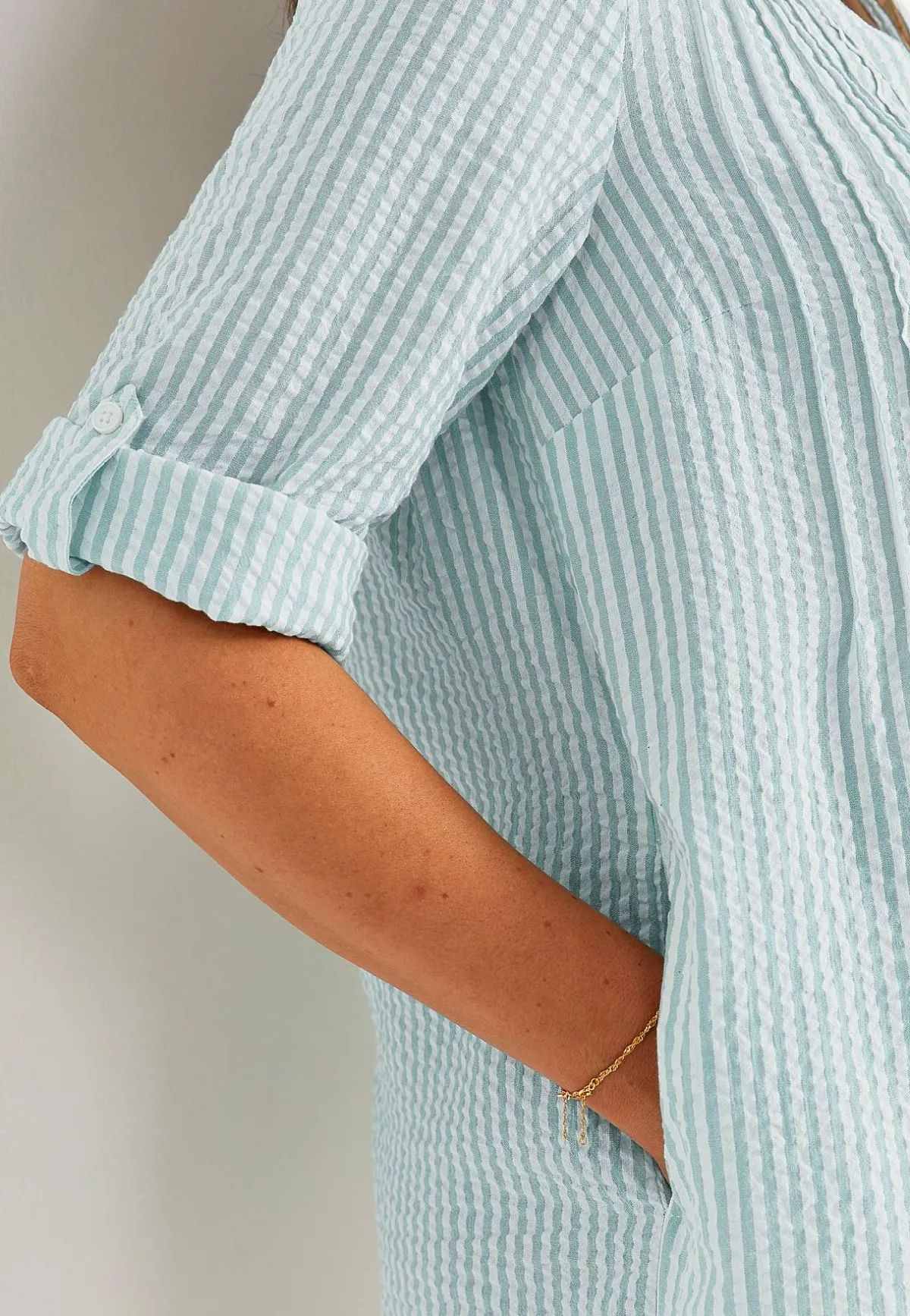 • 3/4-lång, vid uppvikningsbar ärm med knapp.