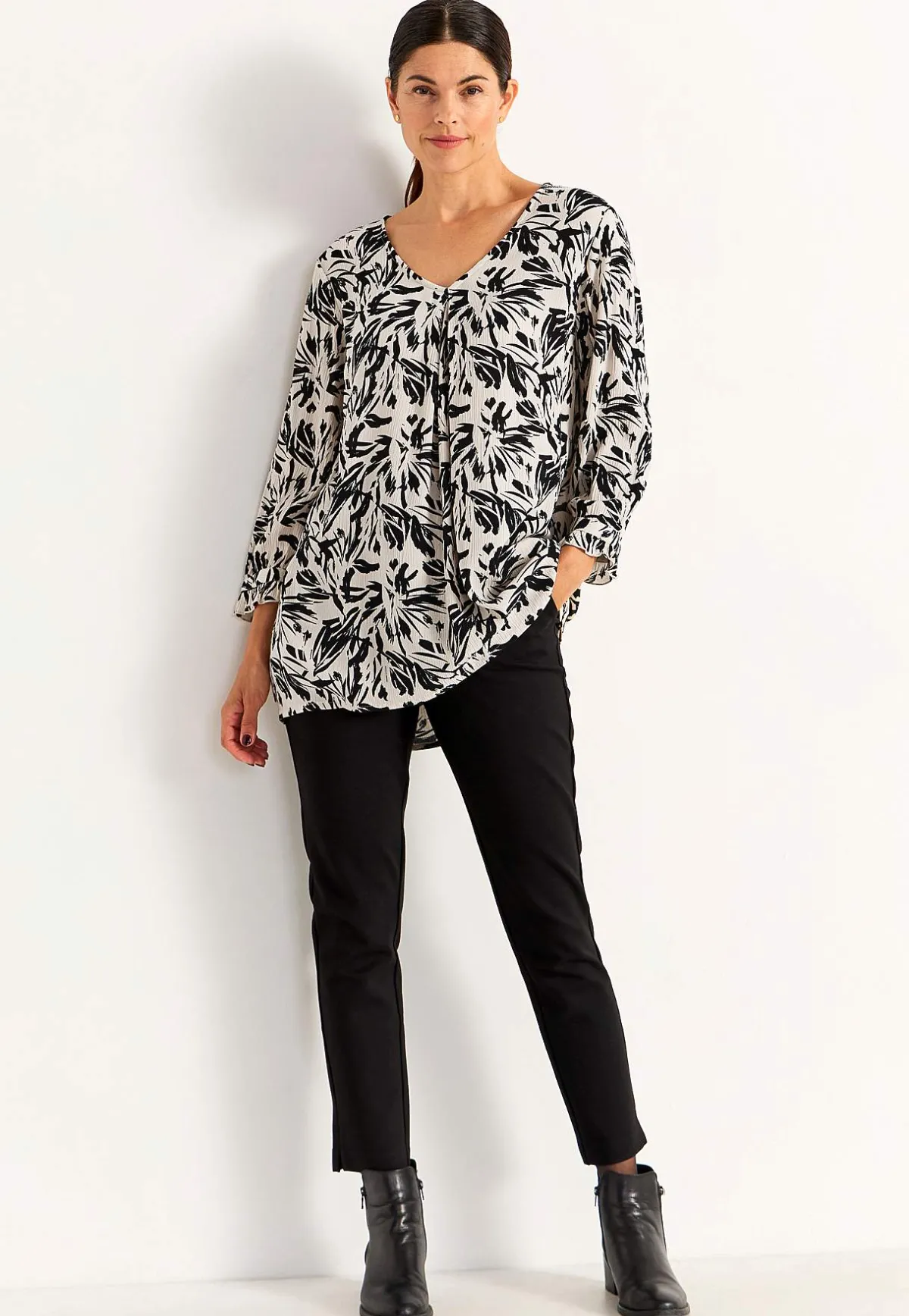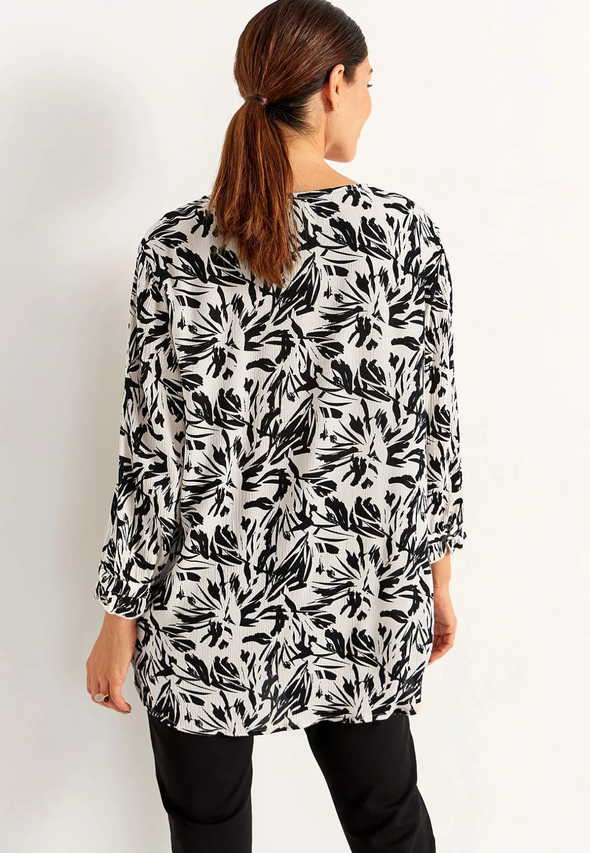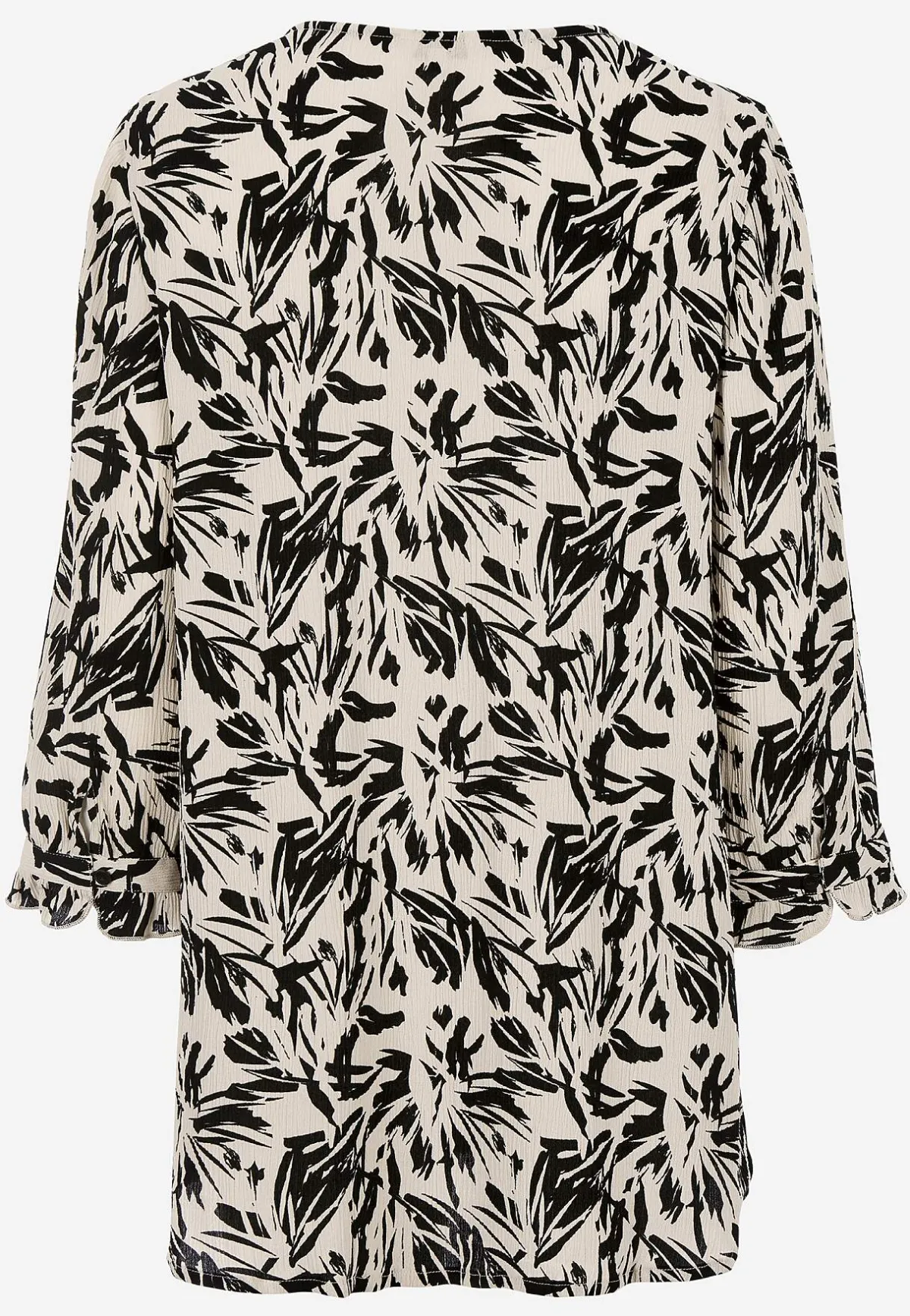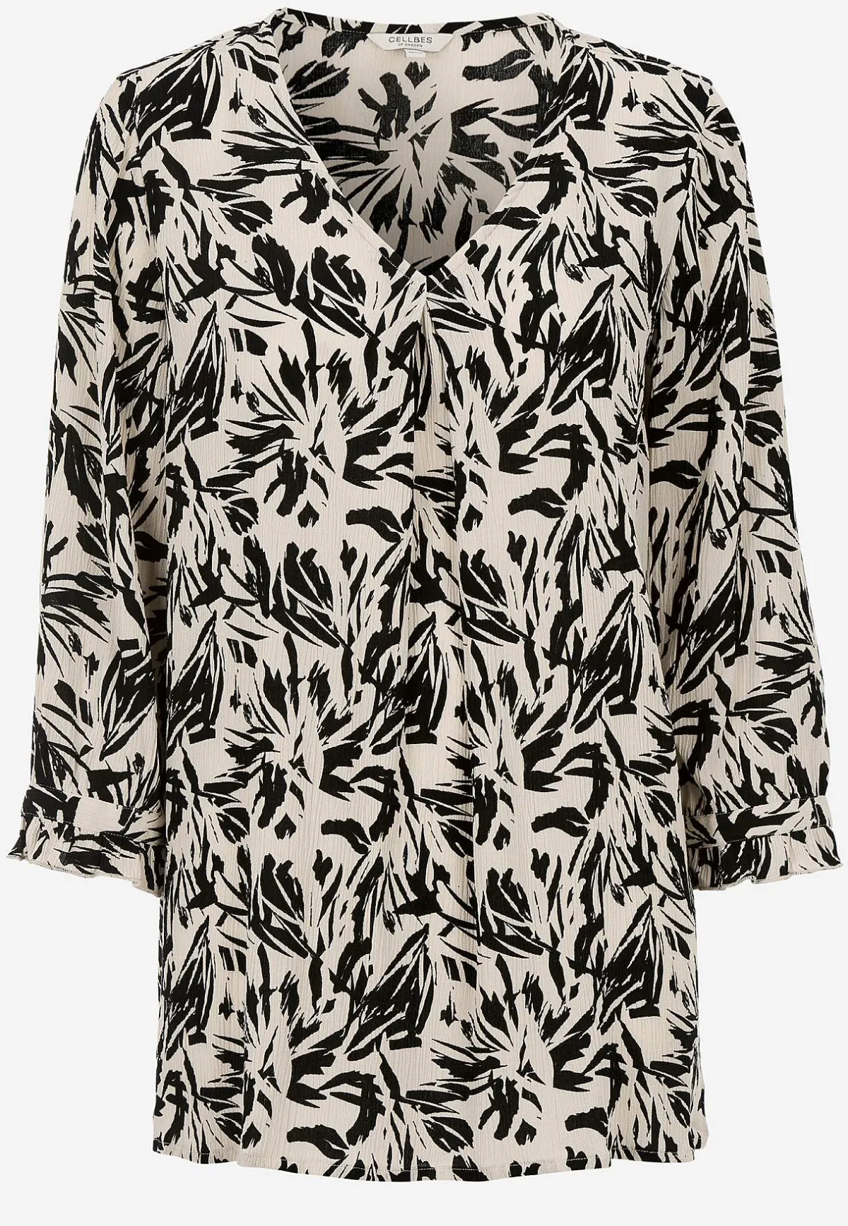 • 3/4-långa ärmar med smal manschett med knapp och romantisk volangkant.