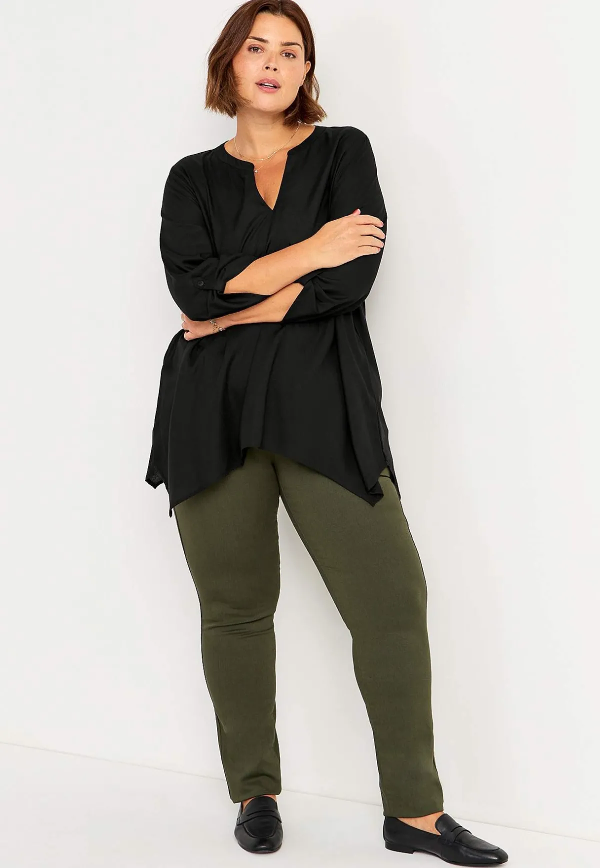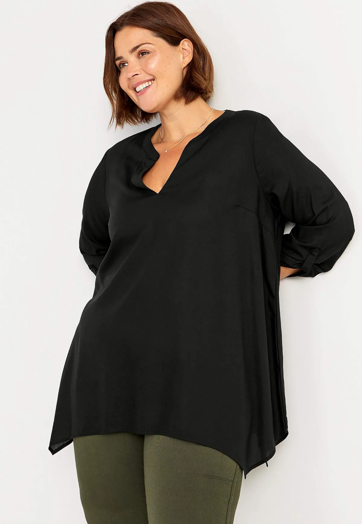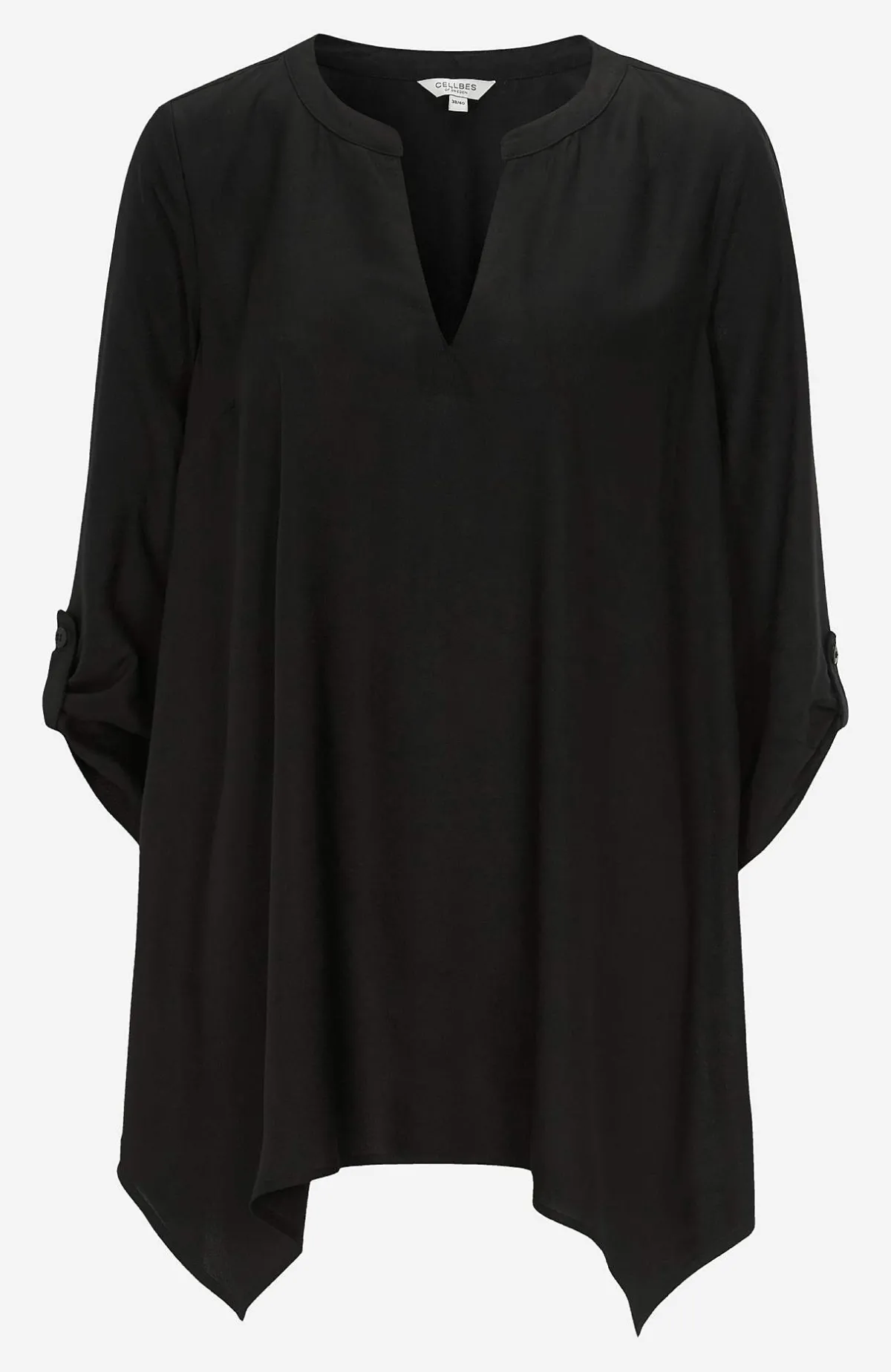 • A-linjeformad tunika med asymmetrisk nederkant.
