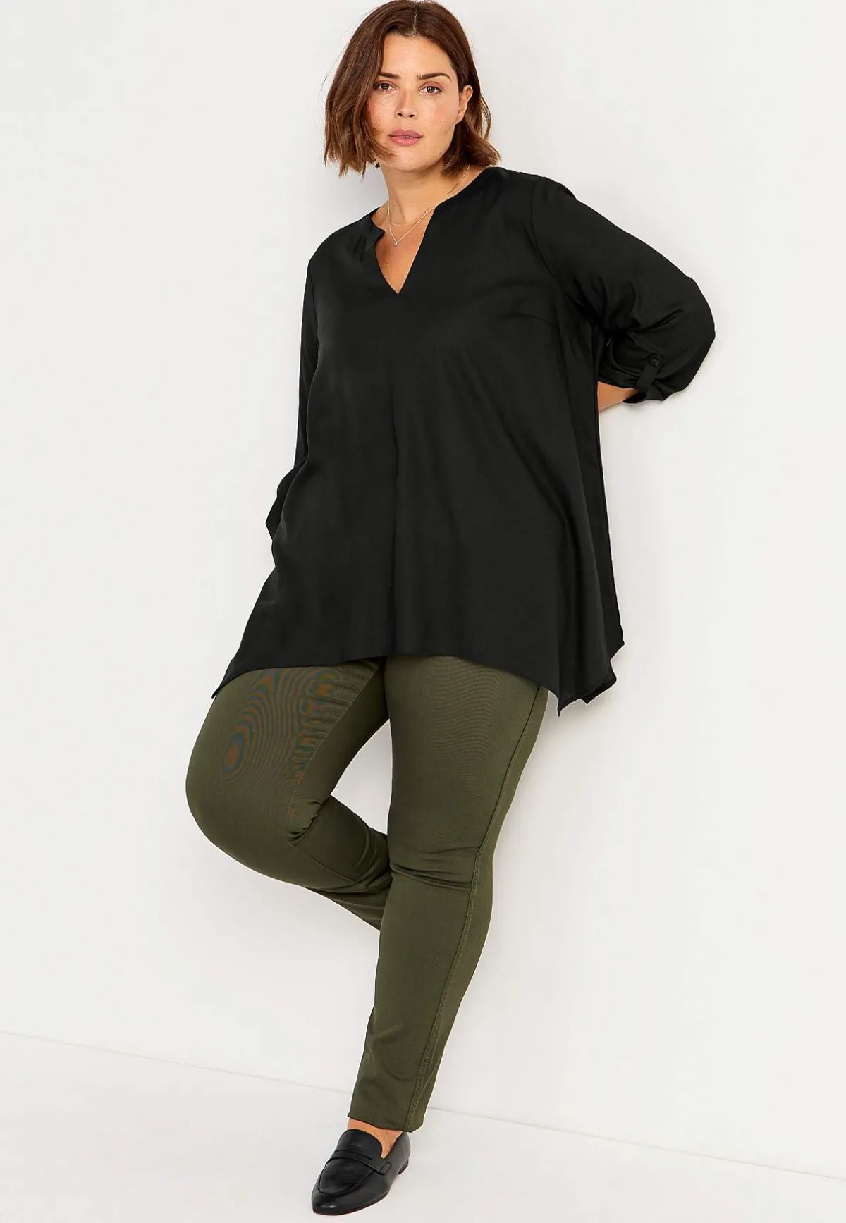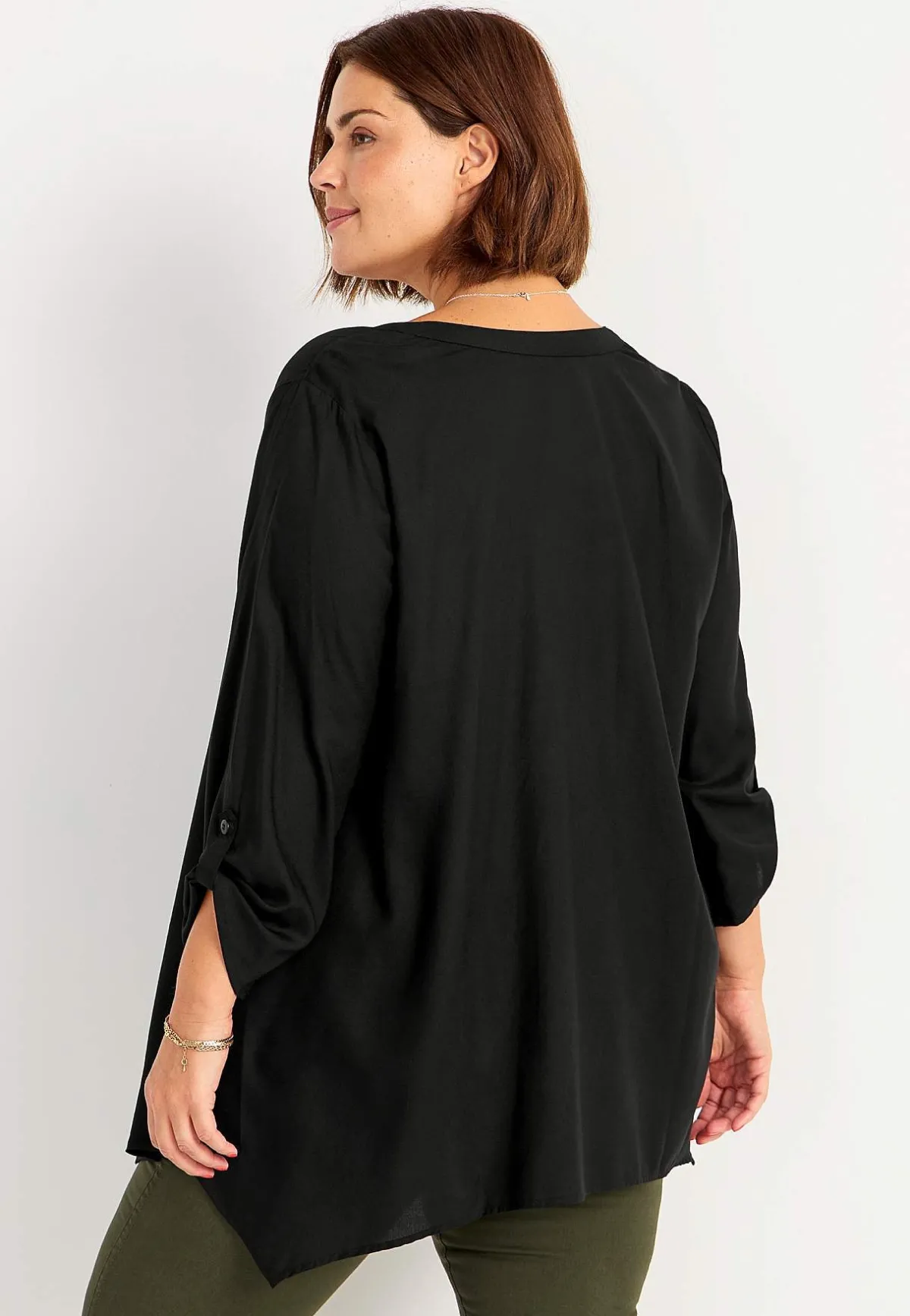 • 3/4-långa, uppvikbara ärmar med slejf och knapp.