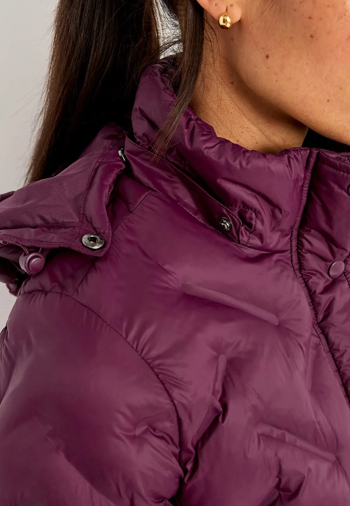 Avtagbar, vadderad huva med dragsko och stopper.
