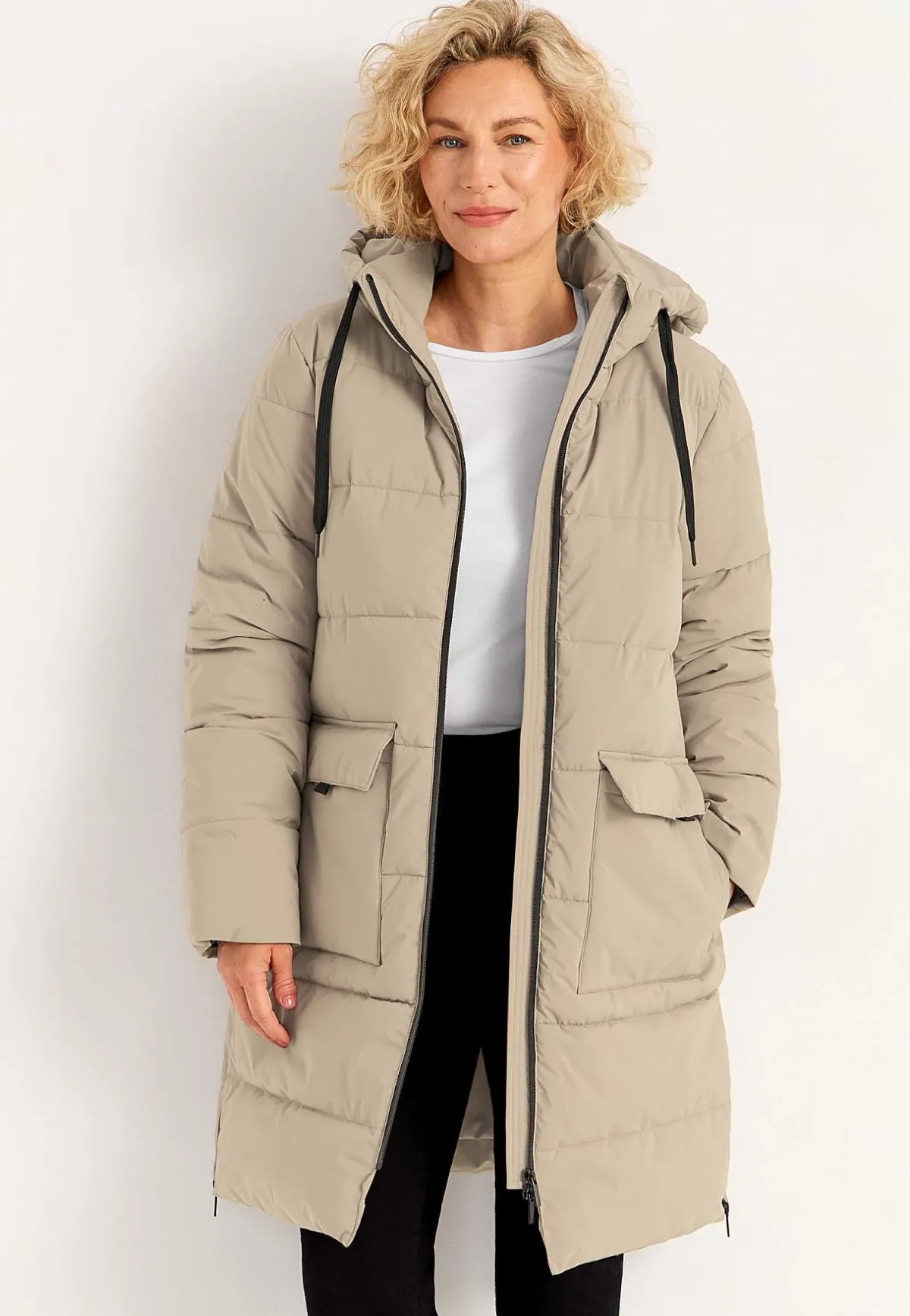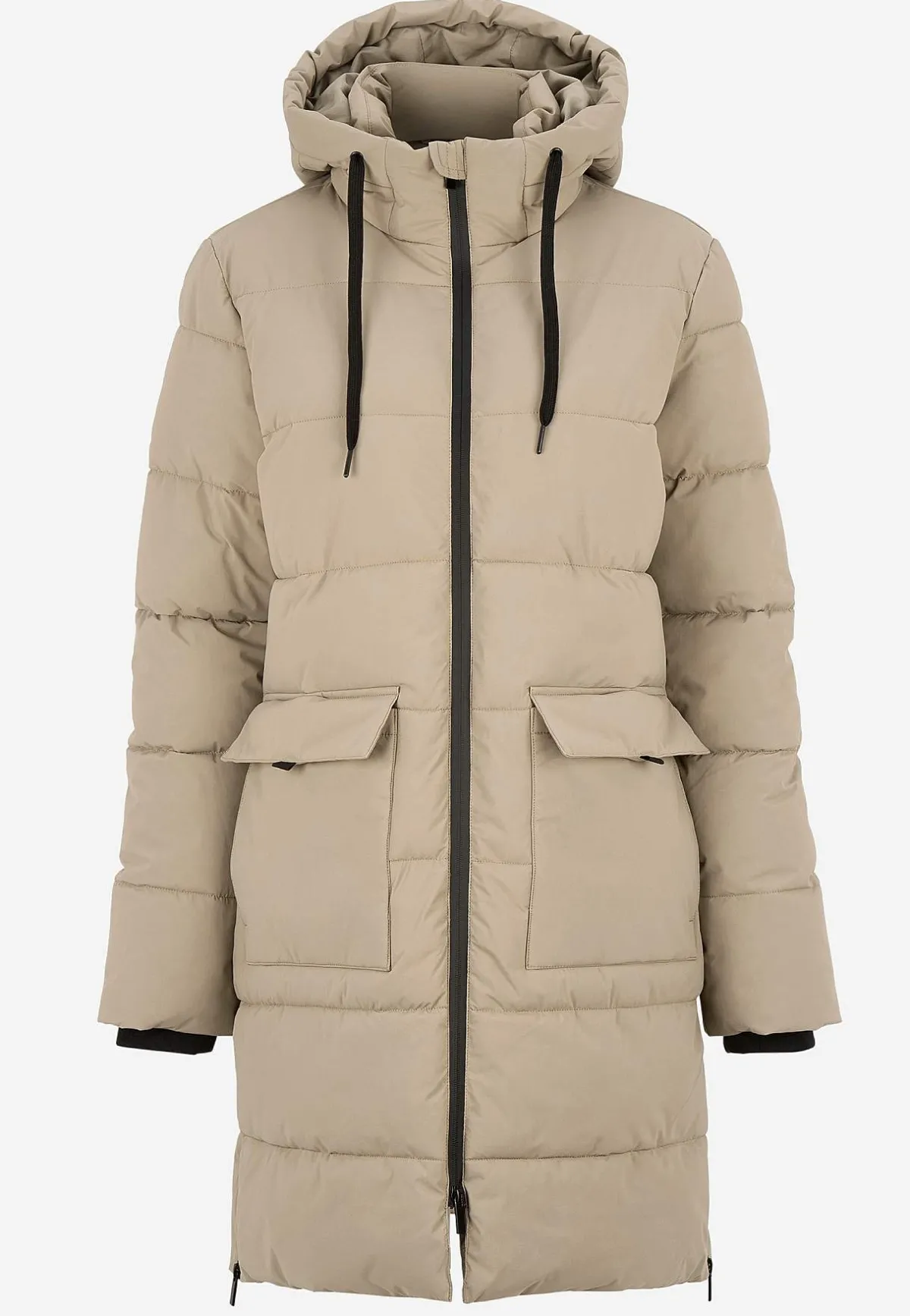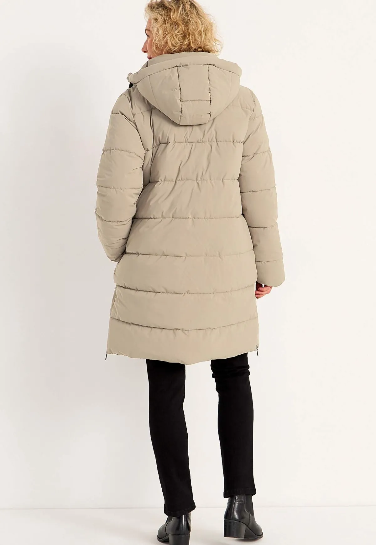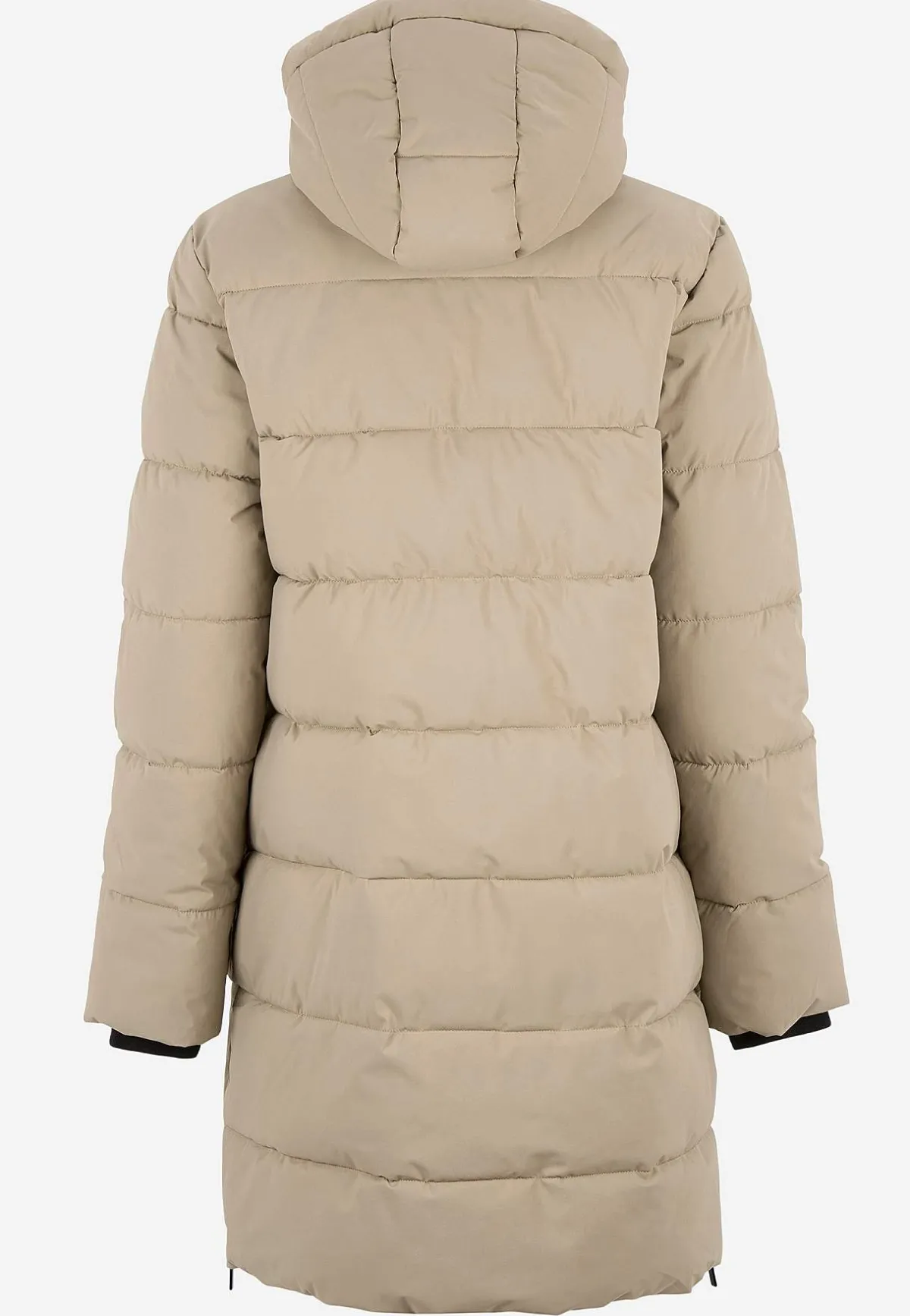 • Vadderad, fastsittande huva med dragsko.