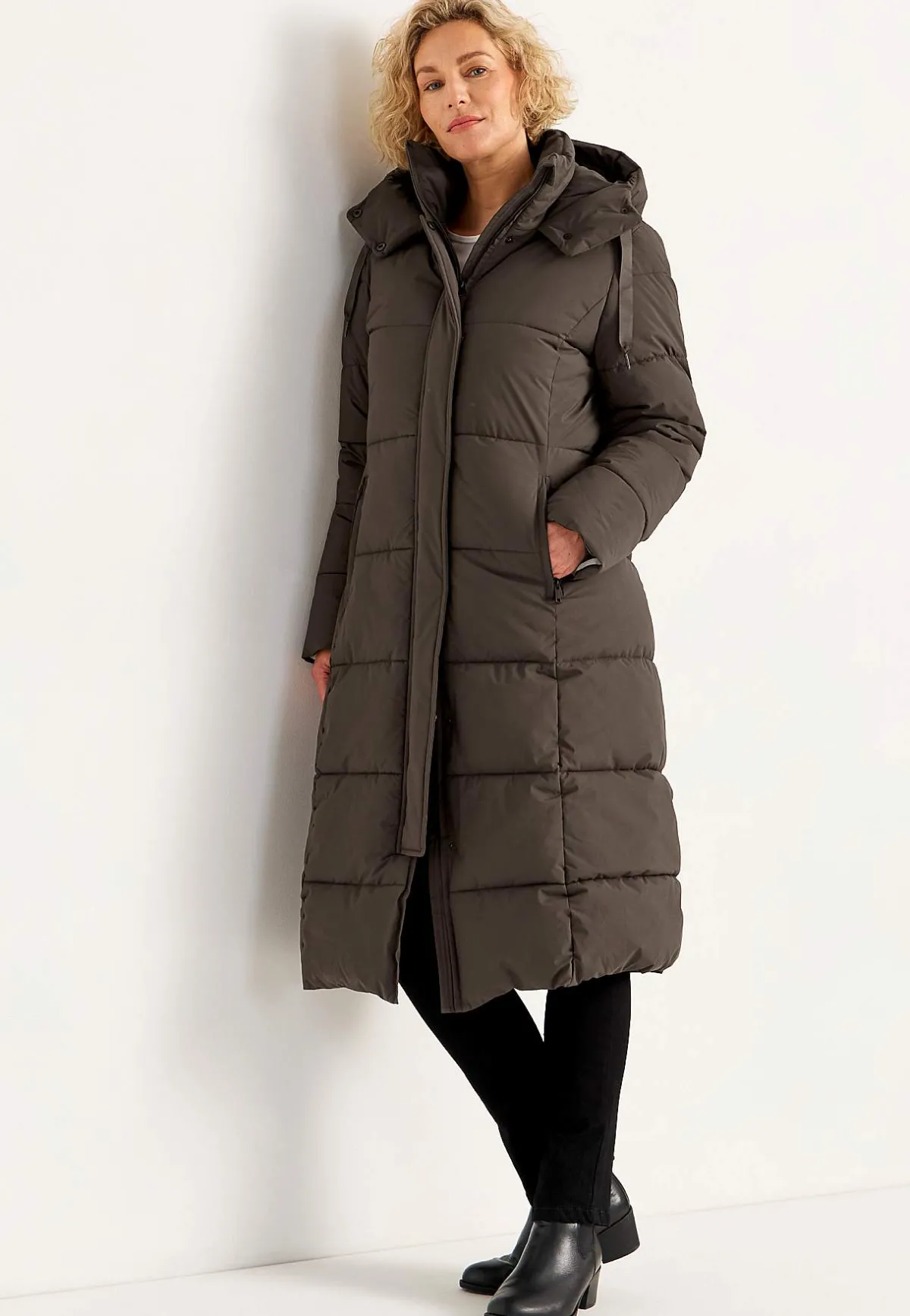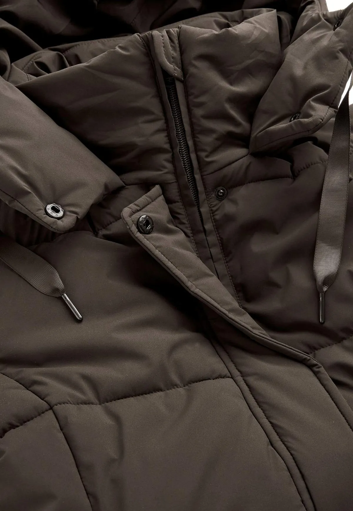• Vadderad, fastsittande huva med dragsko och vävda band.
