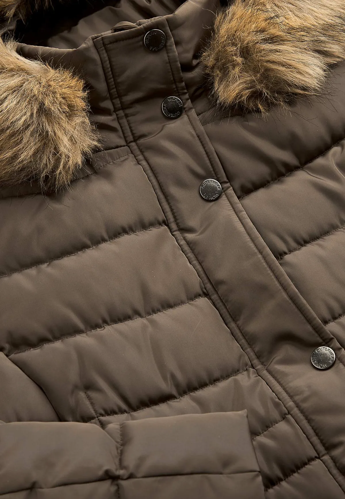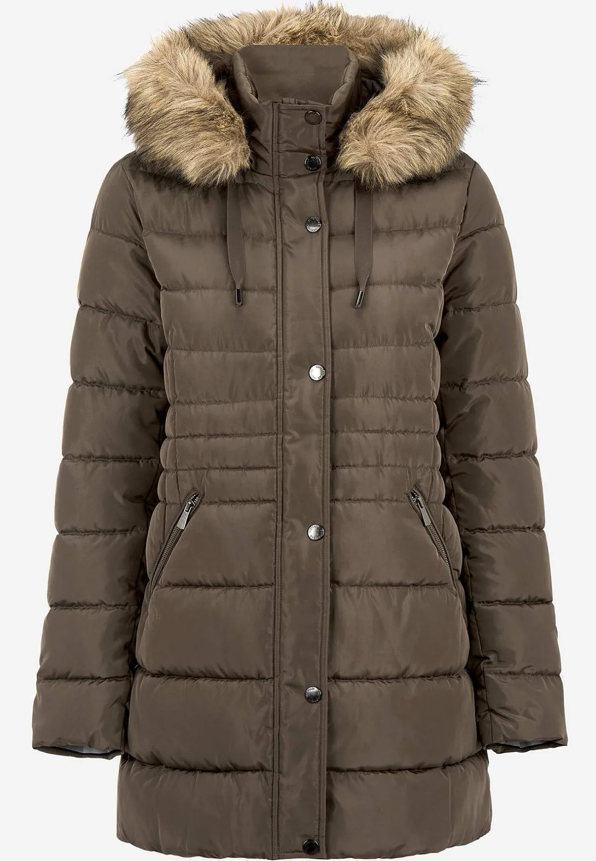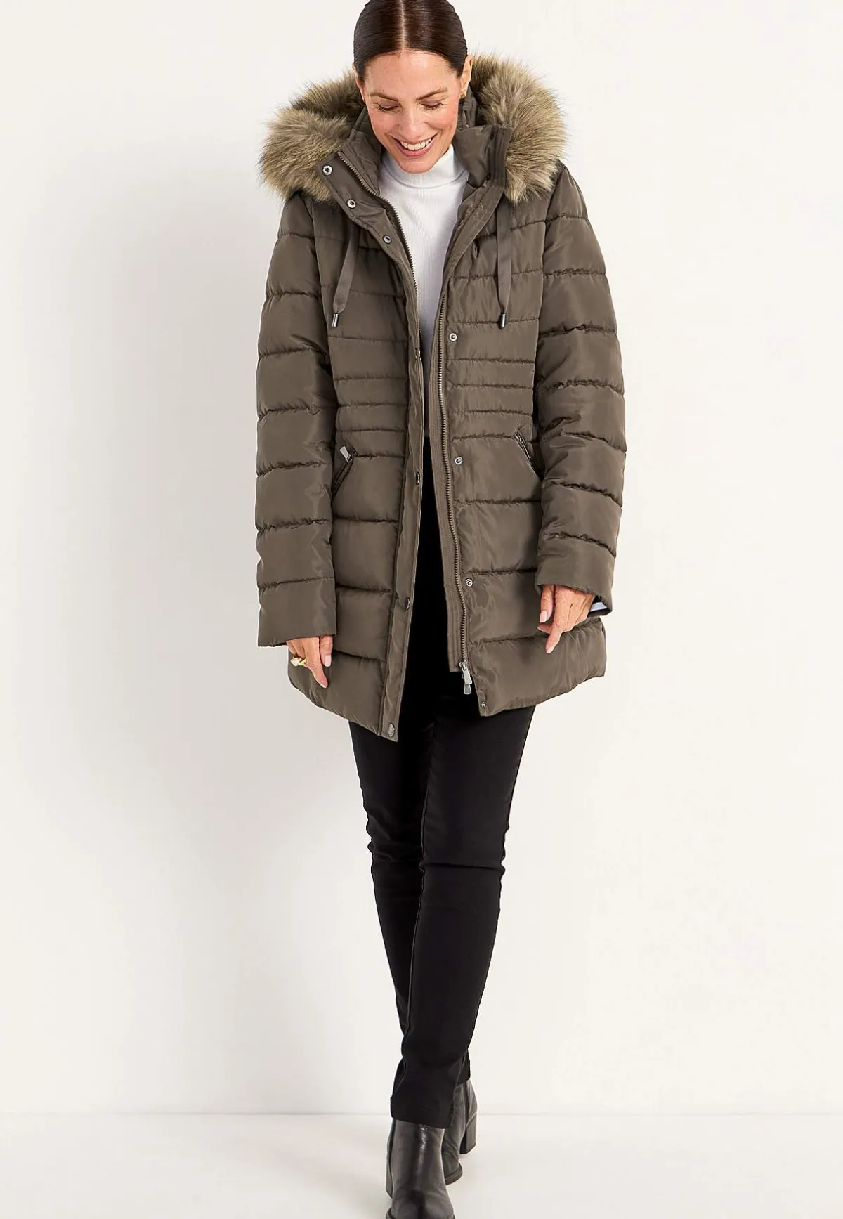 • Avtagbar huva med avtagbar pälsimitation och dragsko.