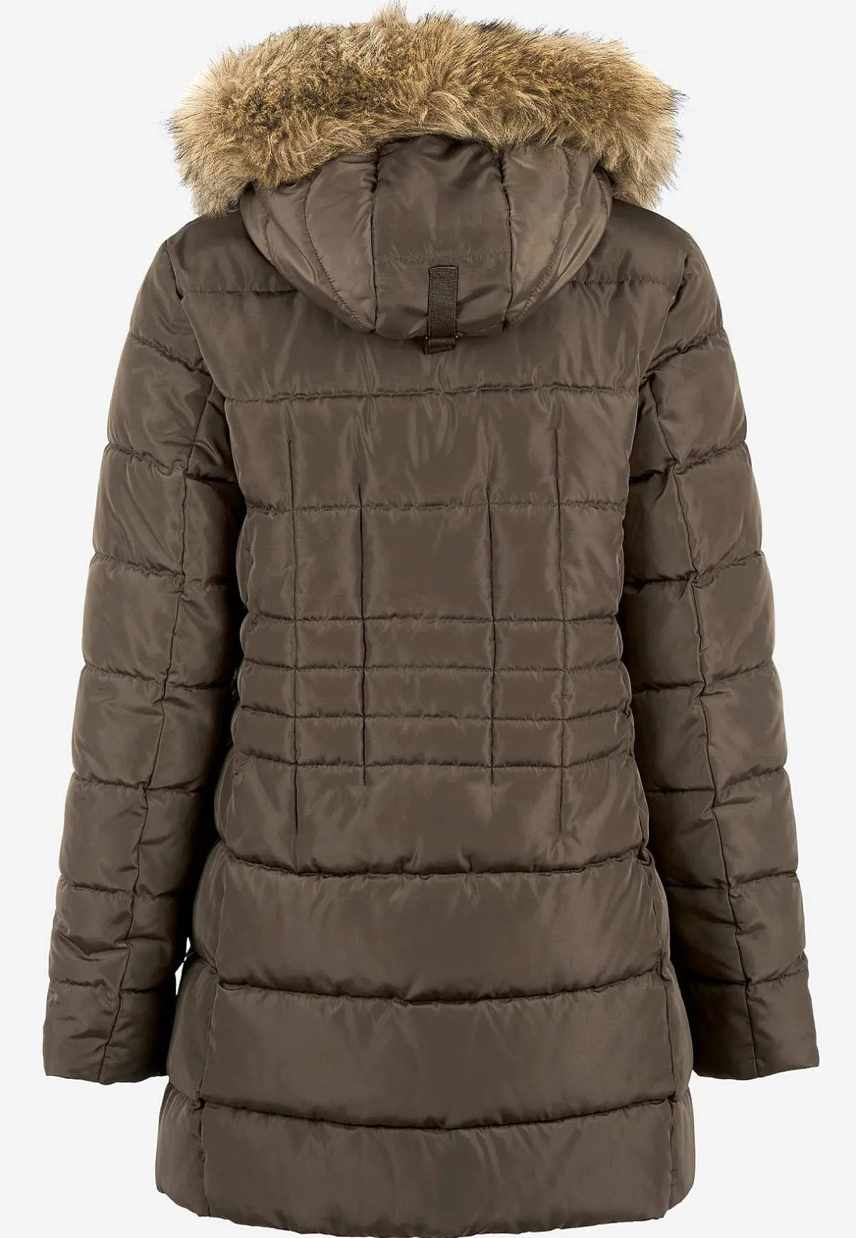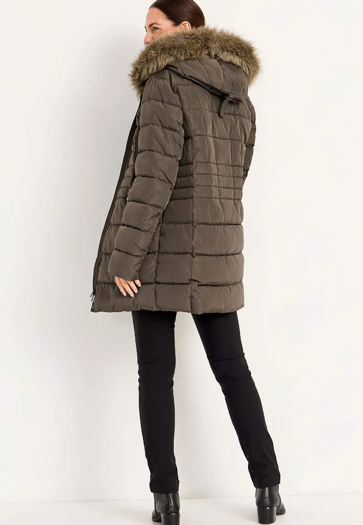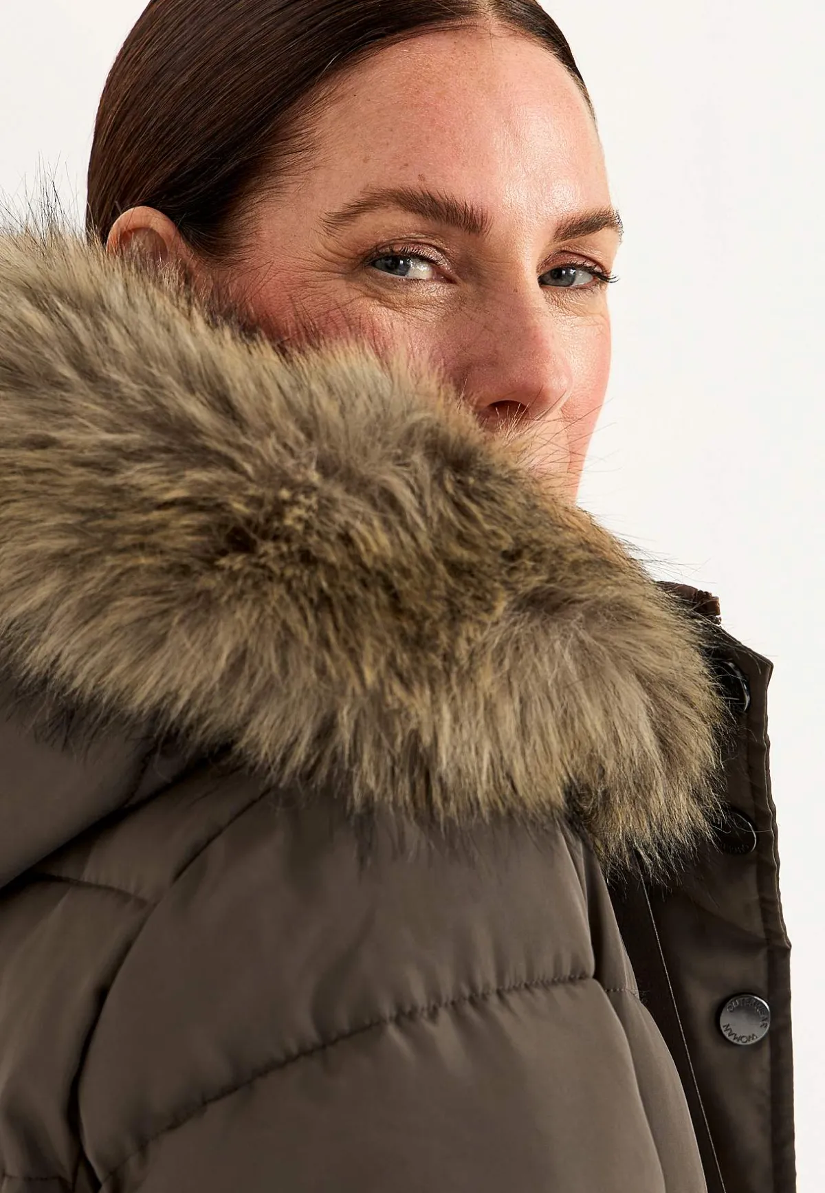 • Avtagbar huva med avtagbar pälsimitation och dragsko.
