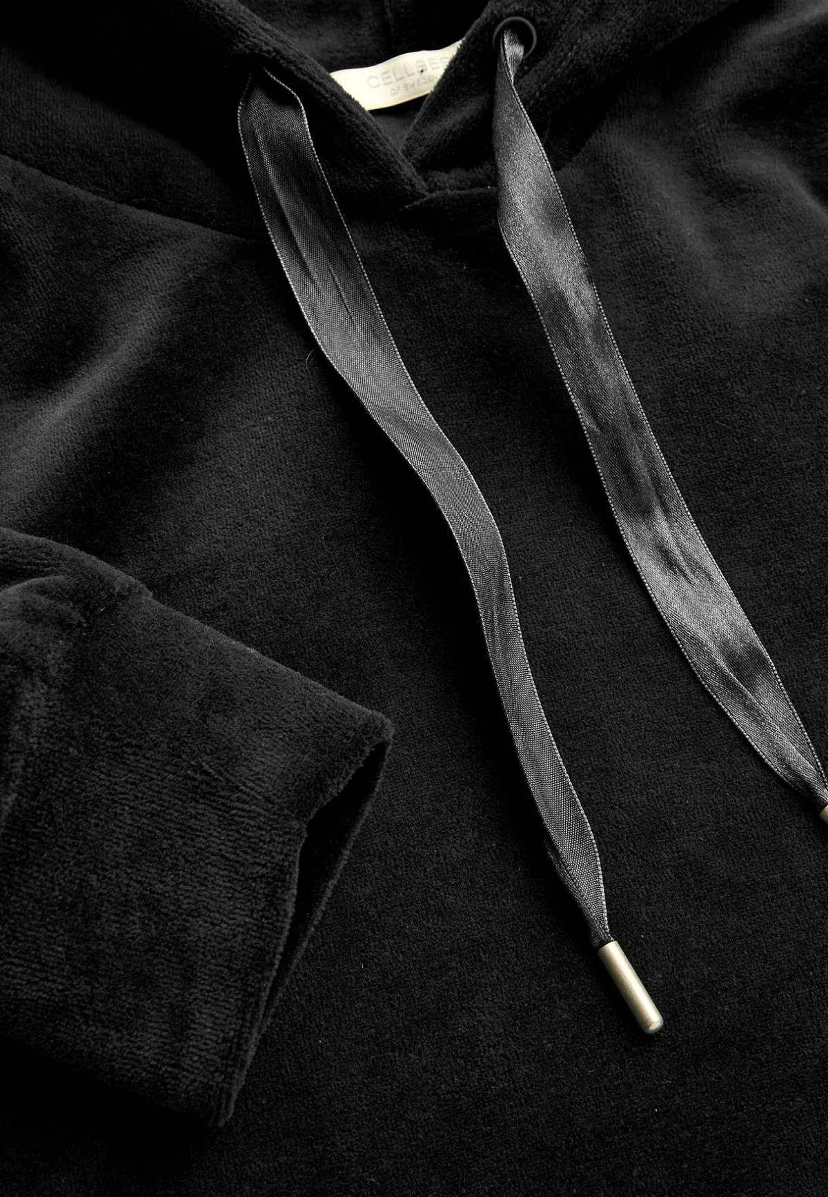 Huva med dragsko i satin och långa ärmar med mudd.