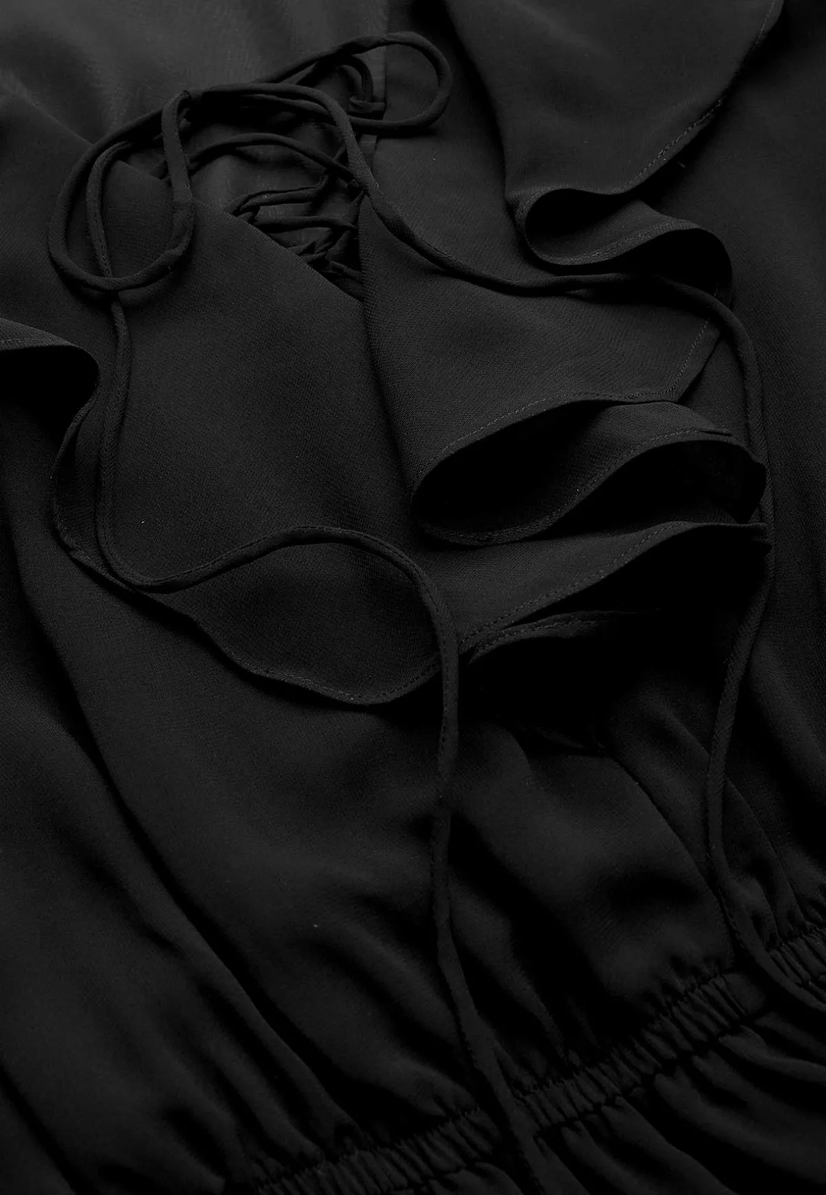 • Djup v-ringning med volang och justerbar snörning.